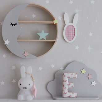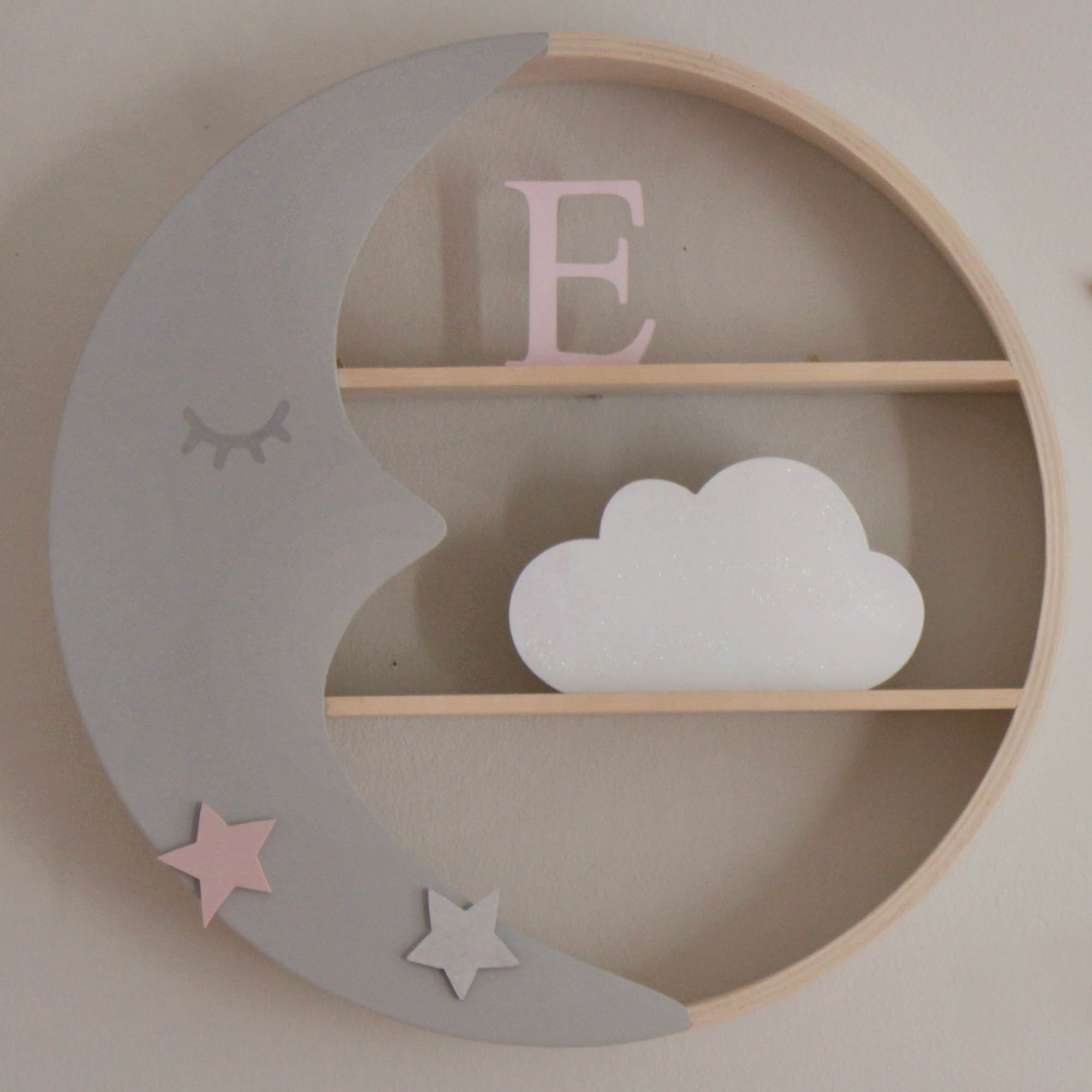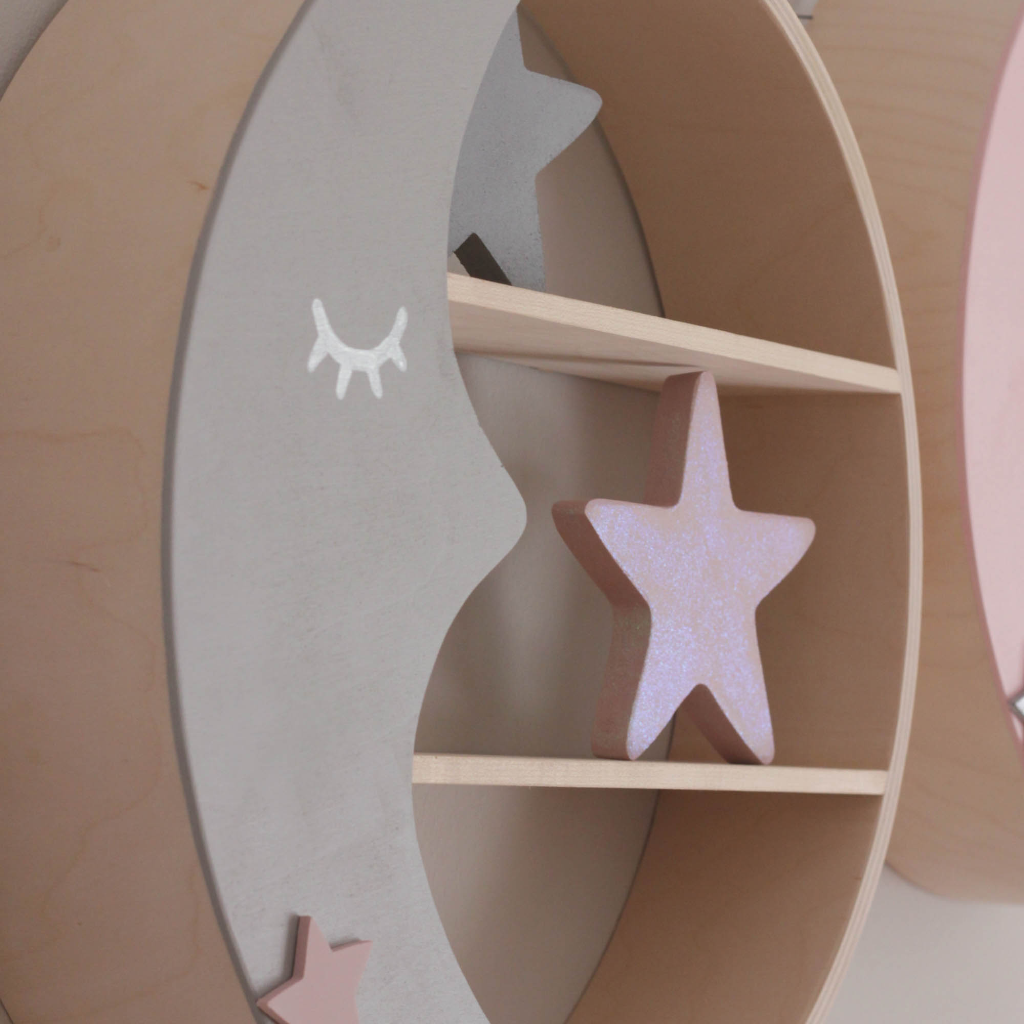Παραμυθένιο στρογγυλό ραφάκι σε σχέδιο φεγγάρι που έχετε λατρέψει και αποτελεί το ιδανικό διακοσμητικό για το παιδικό δωμάτιο. Είναι σε χρώμα φυσικό με γκρι φεγγάρι και δύο διακοσμητικά αστεράκια χρώματος ροζ και γκρι.
