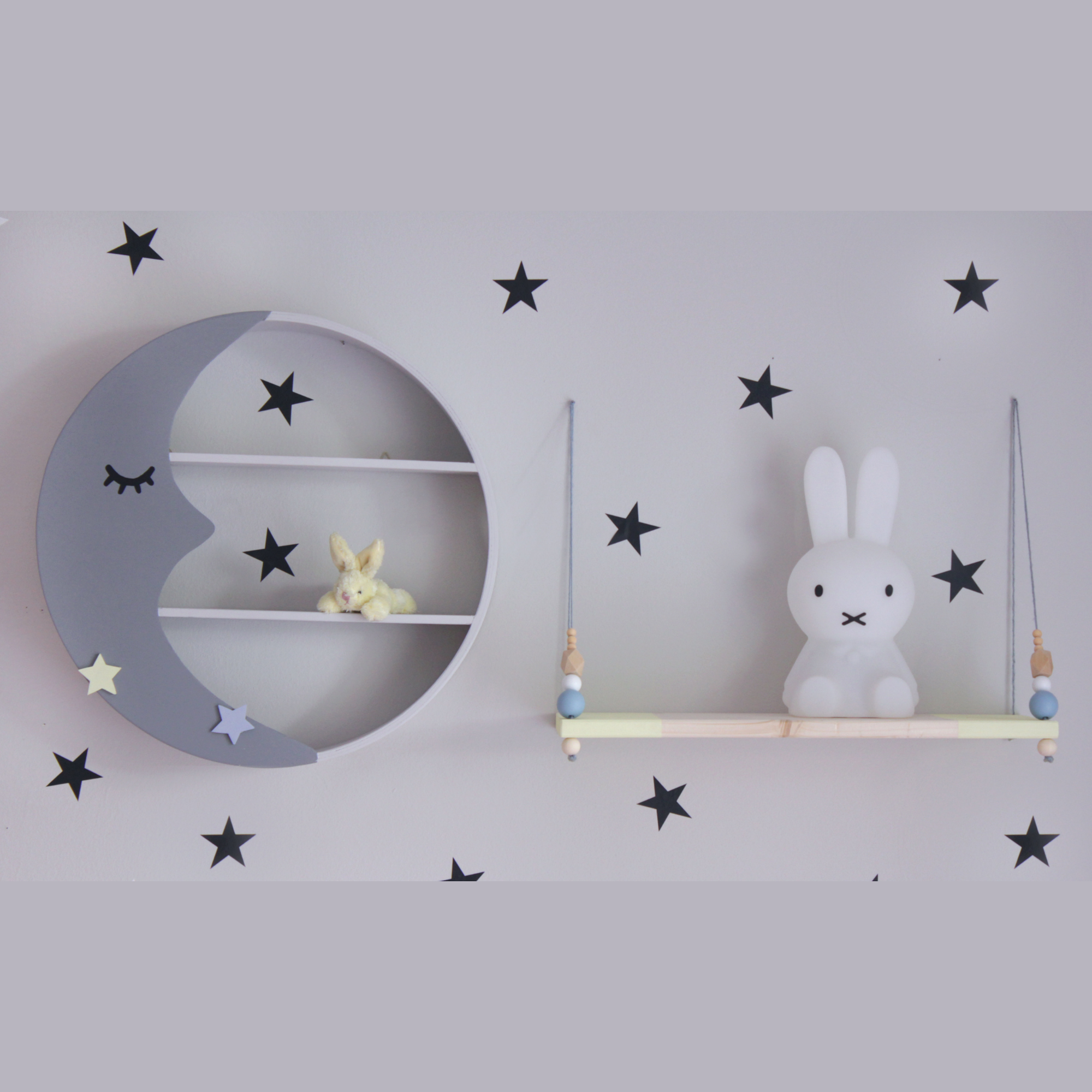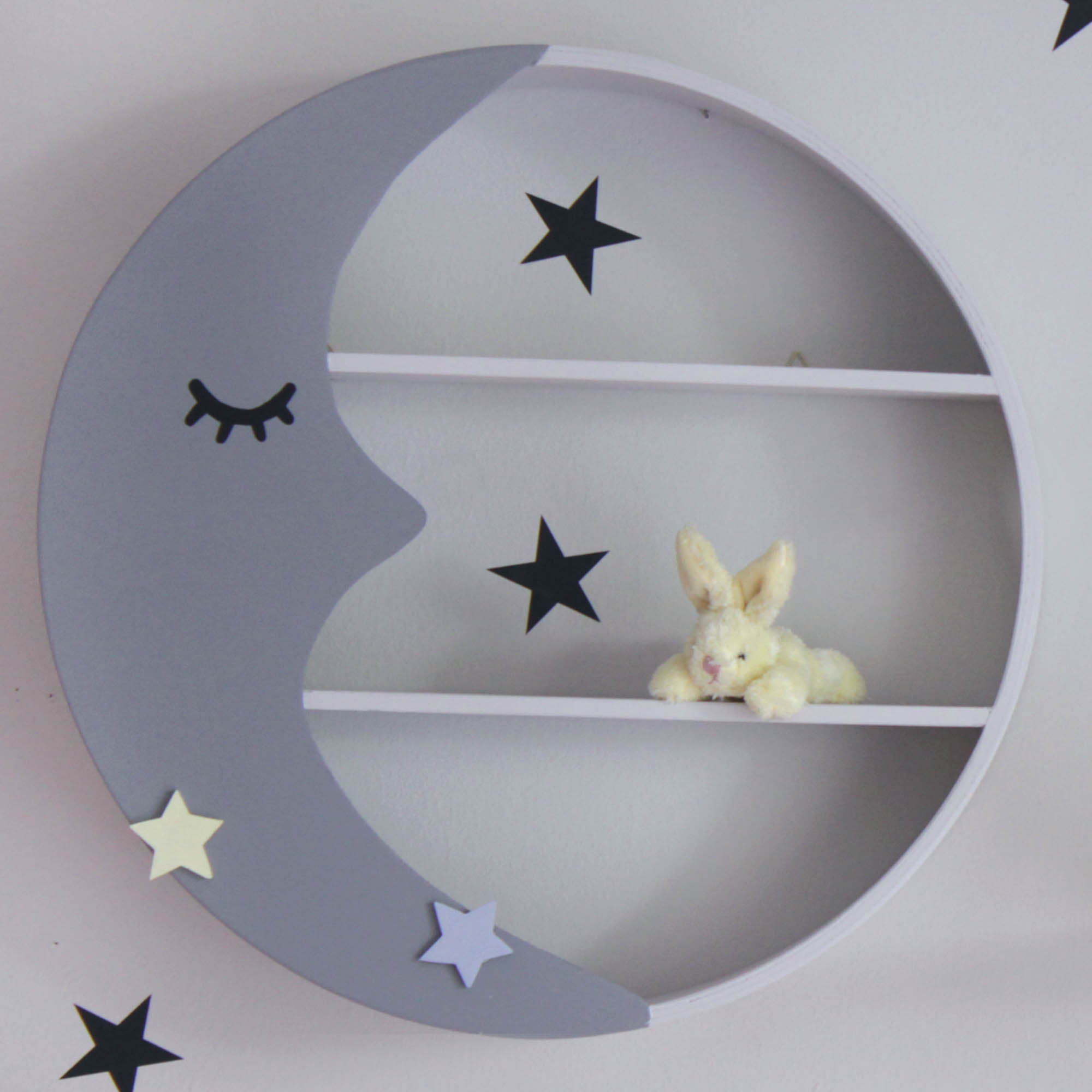 Παραμυθένιο στρογγυλό ραφάκι σε σχέδιο φεγγάρι που έχετε λατρέψει και αποτελεί το ιδανικό διακοσμητικό για το παιδικό δωμάτιο. Είναι σε χρώμα γκρι απαλό με γκρι σκούρο φεγγάρι και δύο διακοσμητικά αστεράκια χρώματος κίτρινο απαλό και θαλασσί.
