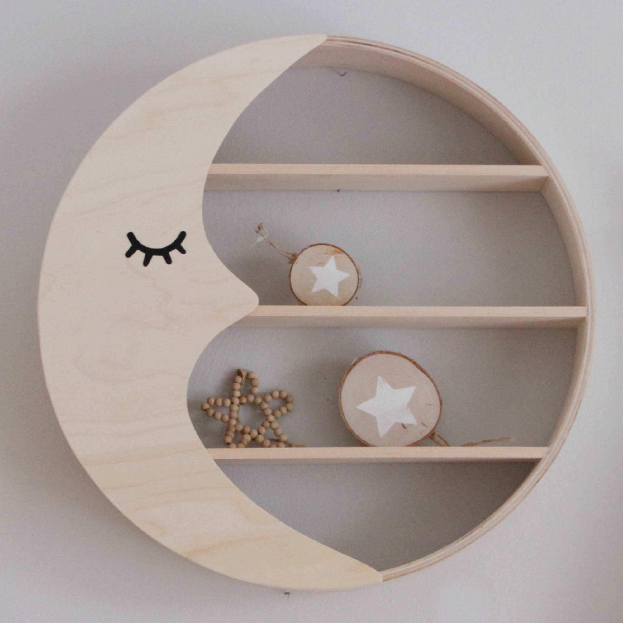 Παραμυθένιο στρογγυλό ραφάκι σε σχέδιο φεγγάρι που έχετε λατρέψει και αποτελεί το ιδανικό διακοσμητικό για το παιδικό δωμάτιο. Είναι σε χρώμα φυσικό.