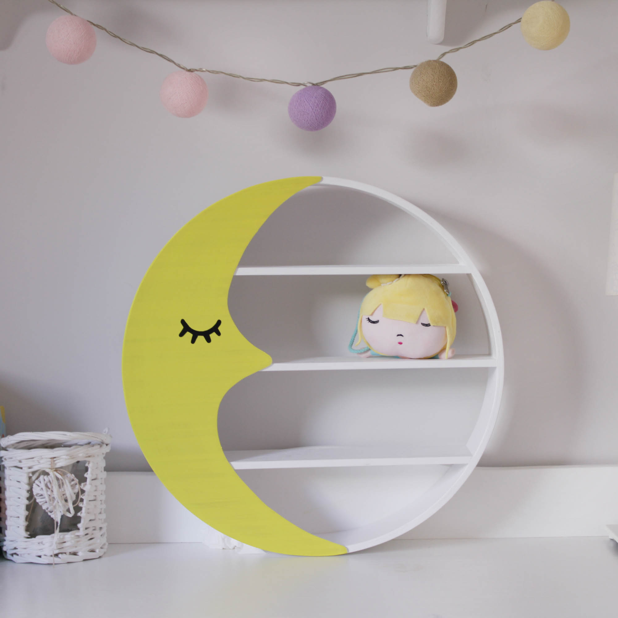 Παραμυθένιο στρογγυλό ραφάκι σε σχέδιο φεγγάρι που έχετε λατρέψει και αποτελεί το ιδανικό διακοσμητικό για το παιδικό δωμάτιο. Είναι σε χρώμα λευκό με κίτρινο έντονο φεγγάρι.
