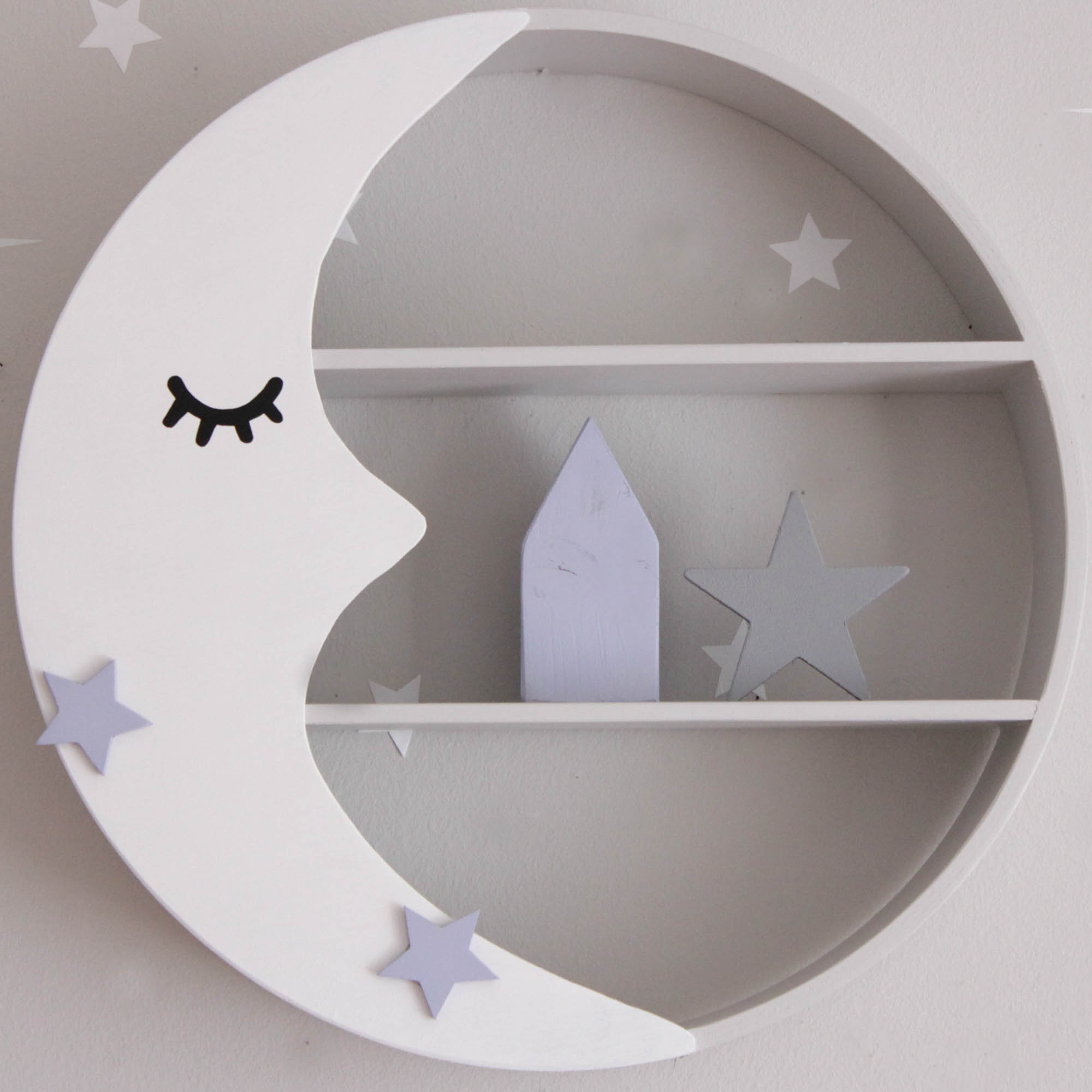 Παραμυθένιο στρογγυλό ραφάκι σε σχέδιο φεγγάρι που έχετε λατρέψει και αποτελεί το ιδανικό διακοσμητικό για το παιδικό δωμάτιο. Είναι σε χρώμα γκρι απαλό με λευκό φεγγάρι και δύο αστεράκια θαλασσί.