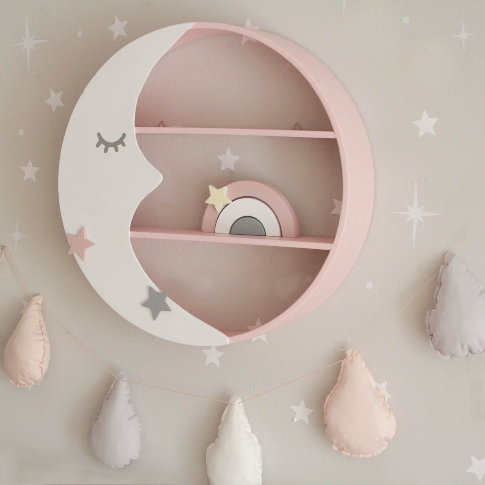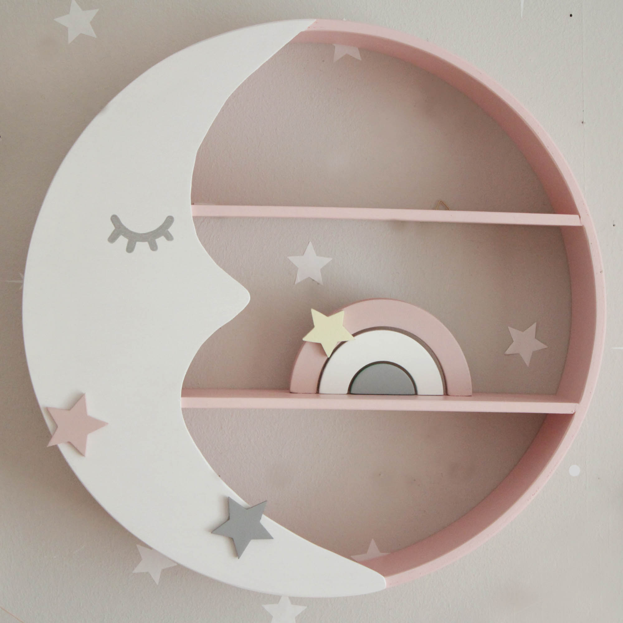 Παραμυθένιο στρογγυλό ραφάκι σε σχέδιο φεγγάρι που έχετε λατρέψει και αποτελεί το ιδανικό διακοσμητικό για το παιδικό δωμάτιο. Είναι σε χρώμα ροζ με λευκό φεγγάρι.