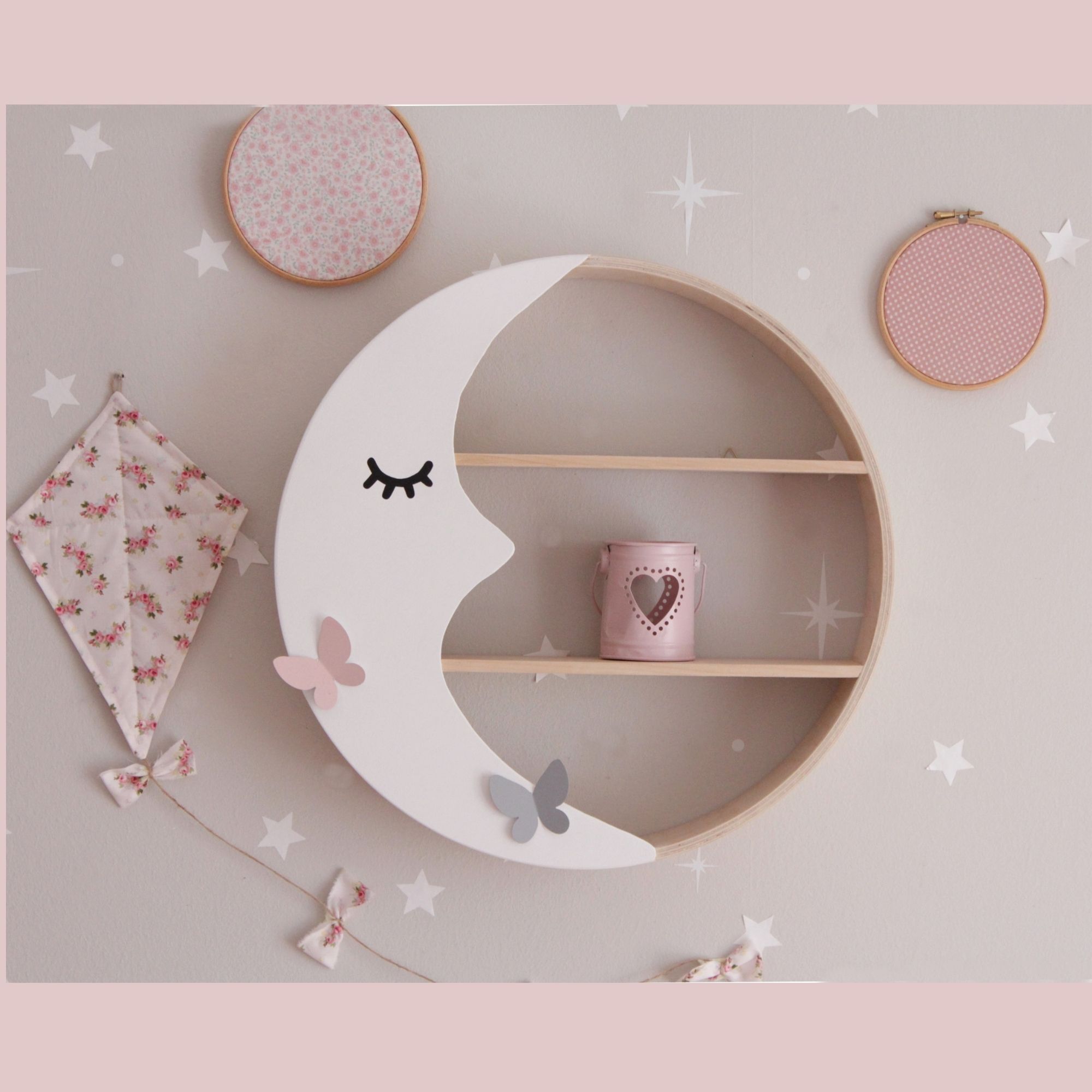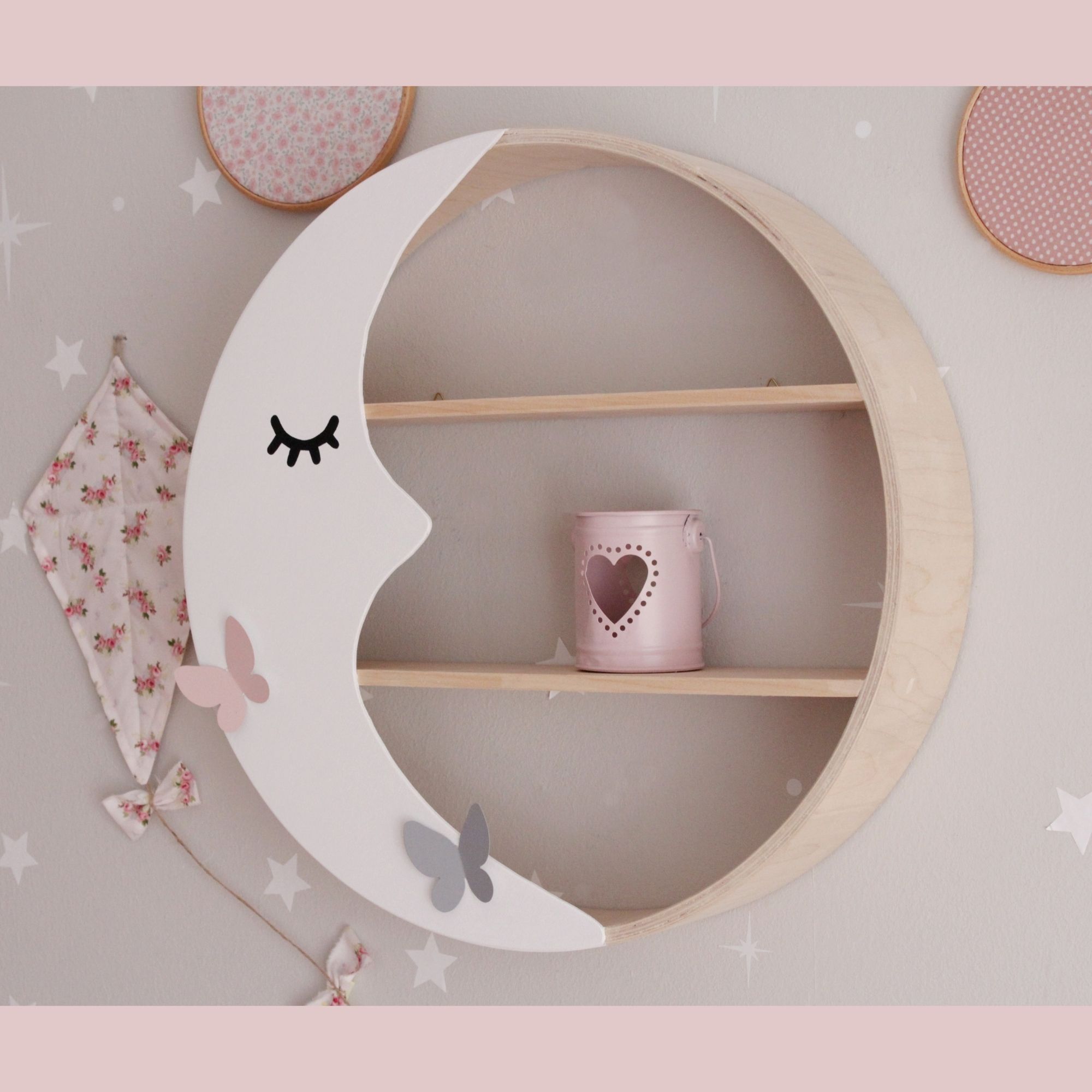Παραμυθένιο στρογγυλό ραφάκι σε σχέδιο φεγγάρι που έχετε λατρέψει και αποτελεί το ιδανικό διακοσμητικό για το παιδικό δωμάτιο. Είναι σε χρώμα φυσικό με λευκό φεγγάρι και δύο διακοσμητικές μεταλλικές πεταλούδες γκρι και ροζ.