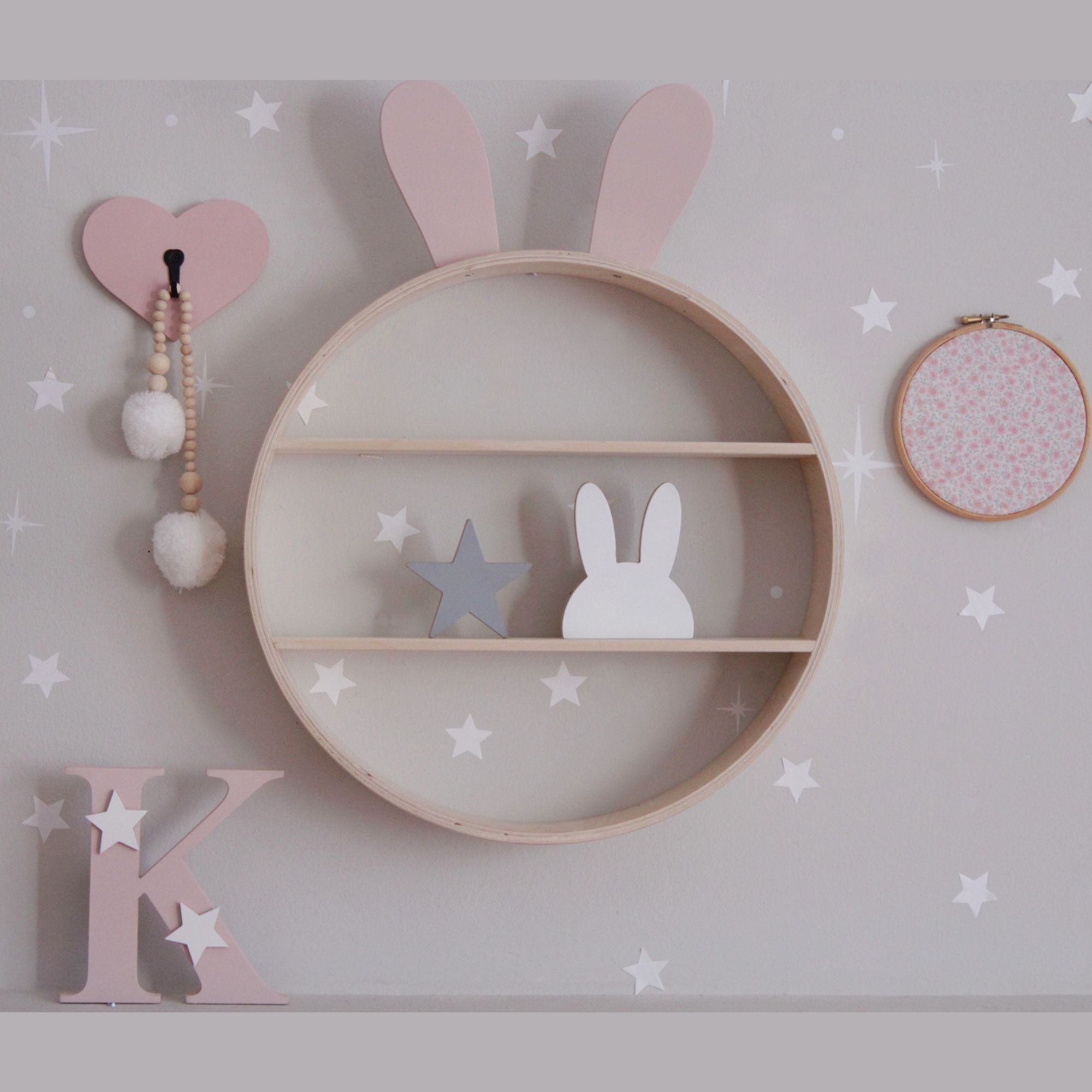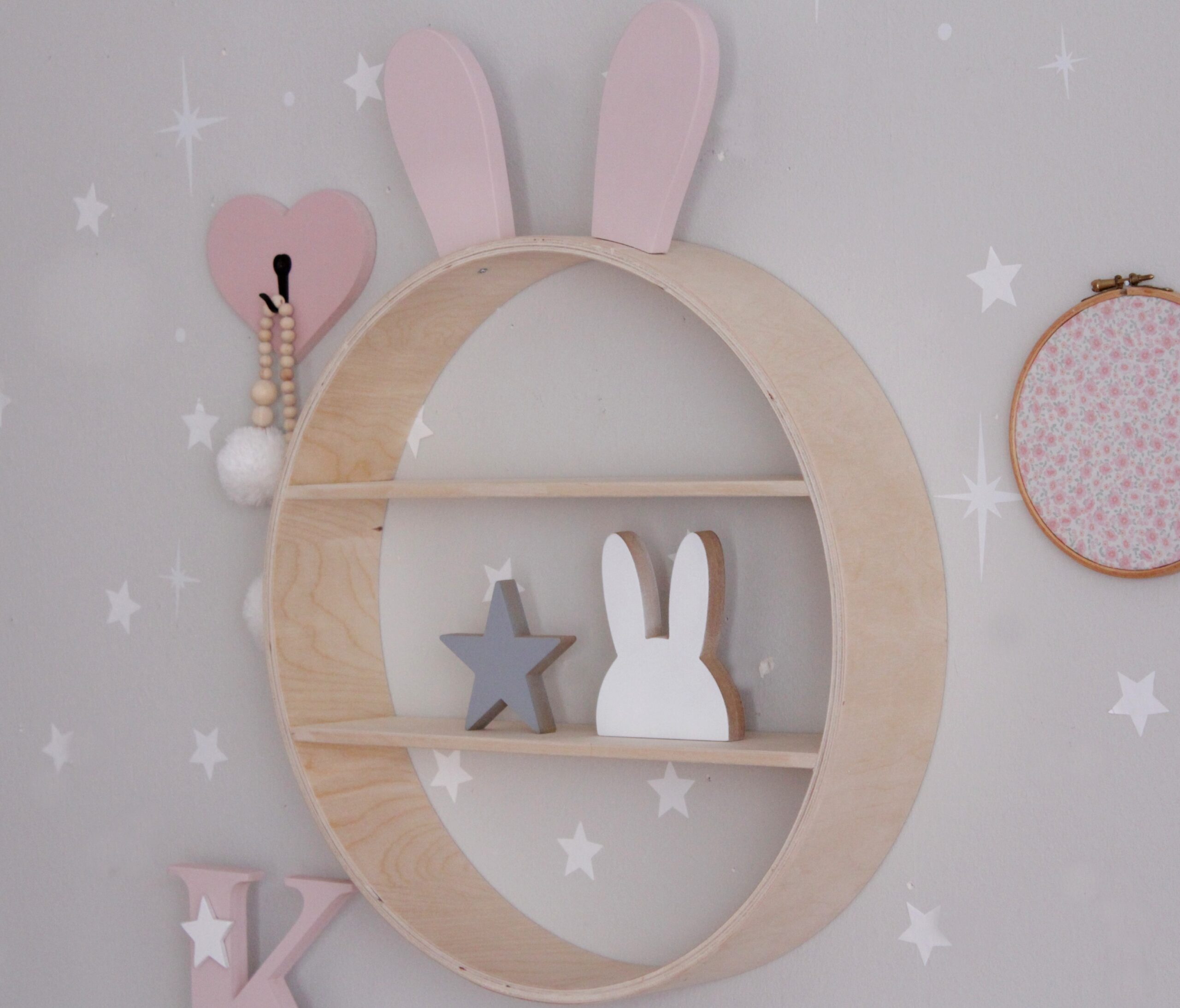 Παραμυθένιο στρογγυλό ραφάκι σε σχέδιο λαγουδάκι ,αποτελεί το ιδανικό διακοσμητικό για το παιδικό δωμάτιο. Είναι σε χρώμα φυσικό με ροζ αυτάκια.