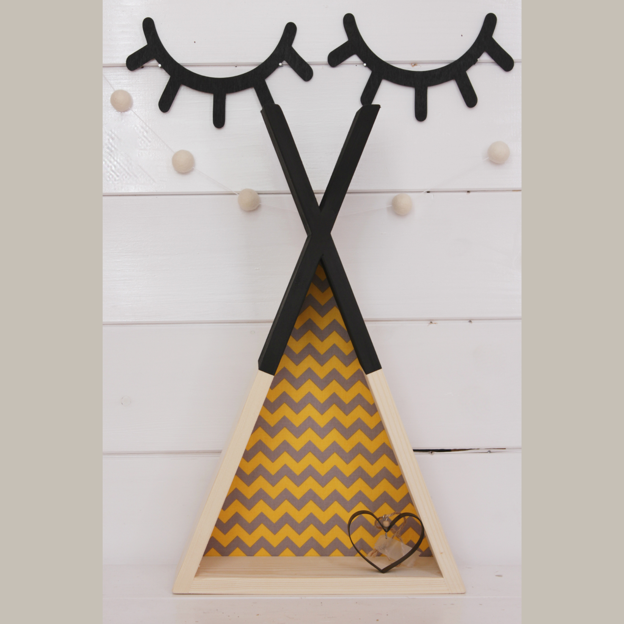 Ραφάκι σε σχέδιο σκηνή σε φυσικό χρώμα με βαμμένη κορυφή σε χρώμα μαύρο. Στο πίσω μέρος υπάρχει ξύλινη πλάτη ντυμένη με ύφασμα κίτρινο/γκρι chevron (ζιγκ ζαγκ) Το ραφάκι είναι από ξύλο πεύκου χωρίς κάποια επεξεργασία, χειροποίητο και στα βαμμένα ραφάκια χρησιμοποιούνται πάντα χρώματα οικολογικά κατάλληλα για παιδικά δωμάτια. Στο πίσω μέρος υπάρχουν εξαρτήματα έτοιμο προς τοποθέτηση.