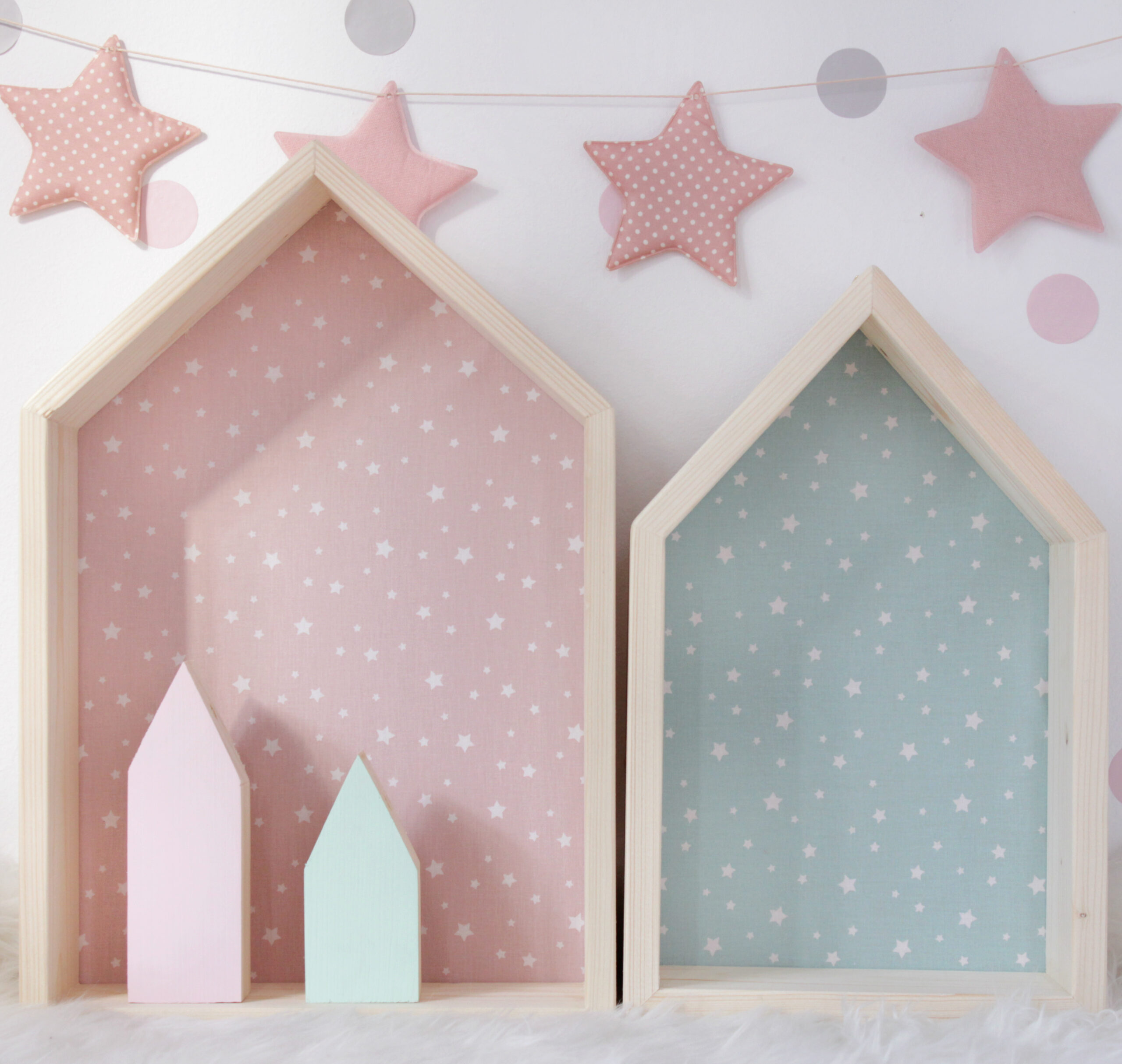 Πανέμορφο ραφάκι σε σχέδιο σπιτάκι σε φυσικό χρώμα με ξύλινη πλάτη ντυμένη με ύφασμα dusty pink με λευκά αστεράκια. Το ραφάκι είναι από ξύλο πεύκου, χειροποίητο και στα βαμμένα ραφάκια χρησιμοποιούνται πάντα χρώματα οικολογικά κατάλληλα για παιδικά δωμάτια. Στο πίσω μέρος υπάρχουν εξαρτήματα στήριξης και είναι έτοιμο προς τοποθέτηση.