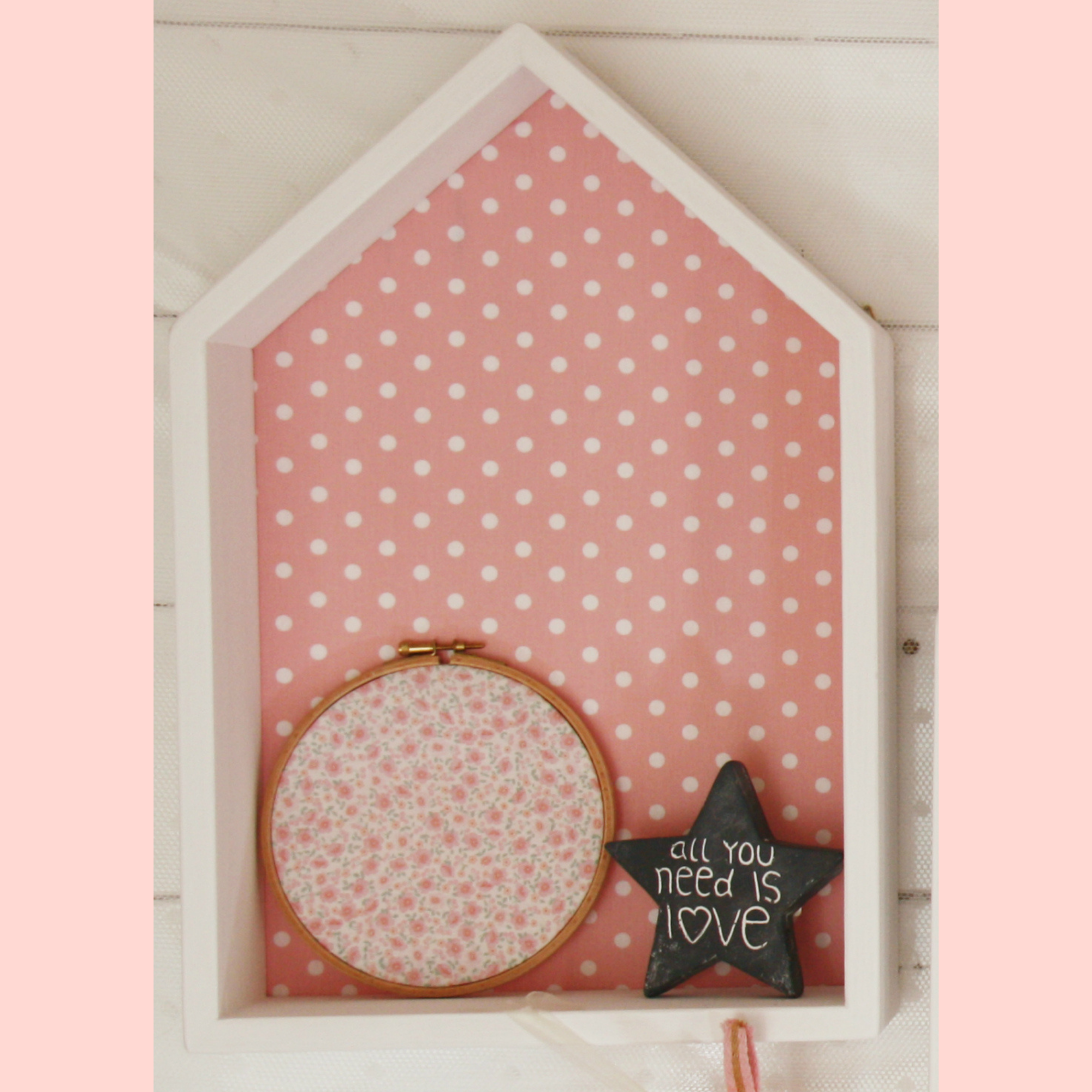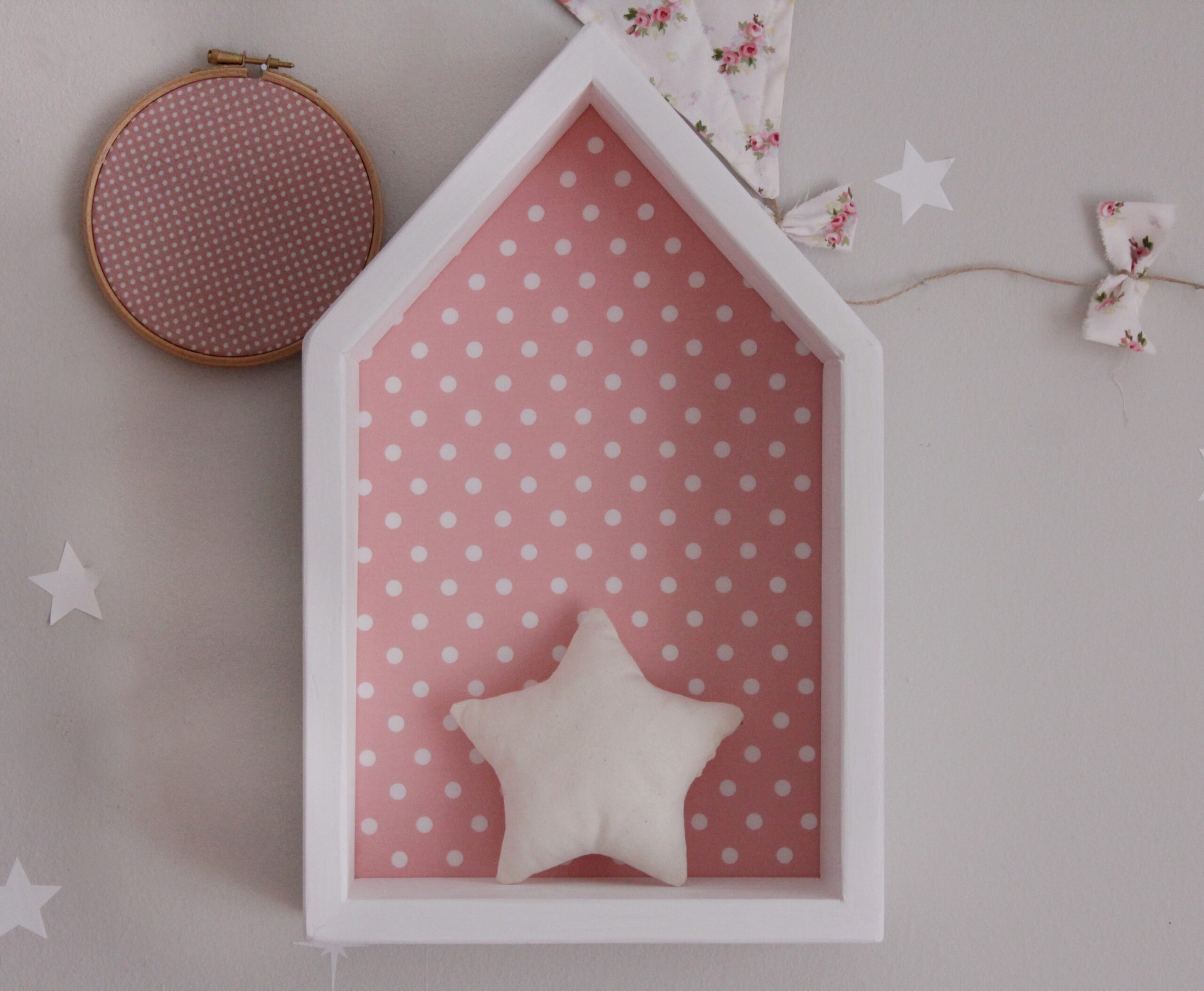 Πανέμορφο ραφάκι σε σχέδιο σπιτάκι σε λευκό χρώμα με ξύλινη πλάτη ντυμένη με ύφασμα ροζ με λευκό πουά. Το ραφάκι είναι από ξύλο πεύκου, χειροποίητο και στα βαμμένα ραφάκια χρησιμοποιούνται πάντα χρώματα οικολογικά κατάλληλα για παιδικά δωμάτια. Στο πίσω μέρος υπάρχουν εξαρτήματα στήριξης και είναι έτοιμο προς τοποθέτηση.