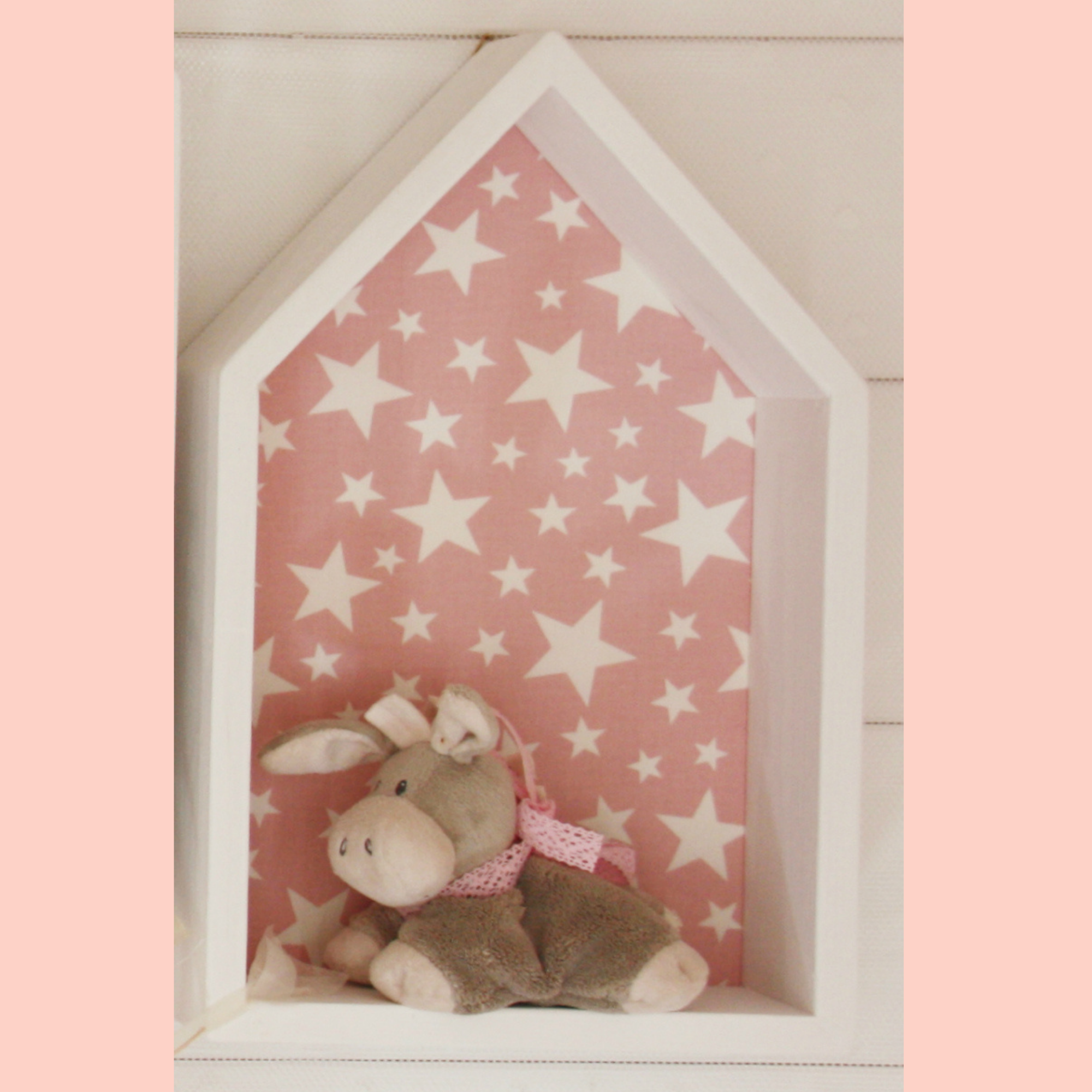 Πανέμορφο ραφάκι σε σχέδιο σπιτάκι σε λευκό χρώμα με ξύλινη πλάτη ντυμένη με ροζ ύφασμα με λευκά αστεράκια. Το ραφάκι είναι από ξύλο πεύκου, χειροποίητο και στα βαμμένα ραφάκια χρησιμοποιούνται πάντα χρώματα οικολογικά κατάλληλα για παιδικά δωμάτια. Στο πίσω μέρος υπάρχουν εξαρτήματα στήριξης και είναι έτοιμο προς τοποθέτηση.