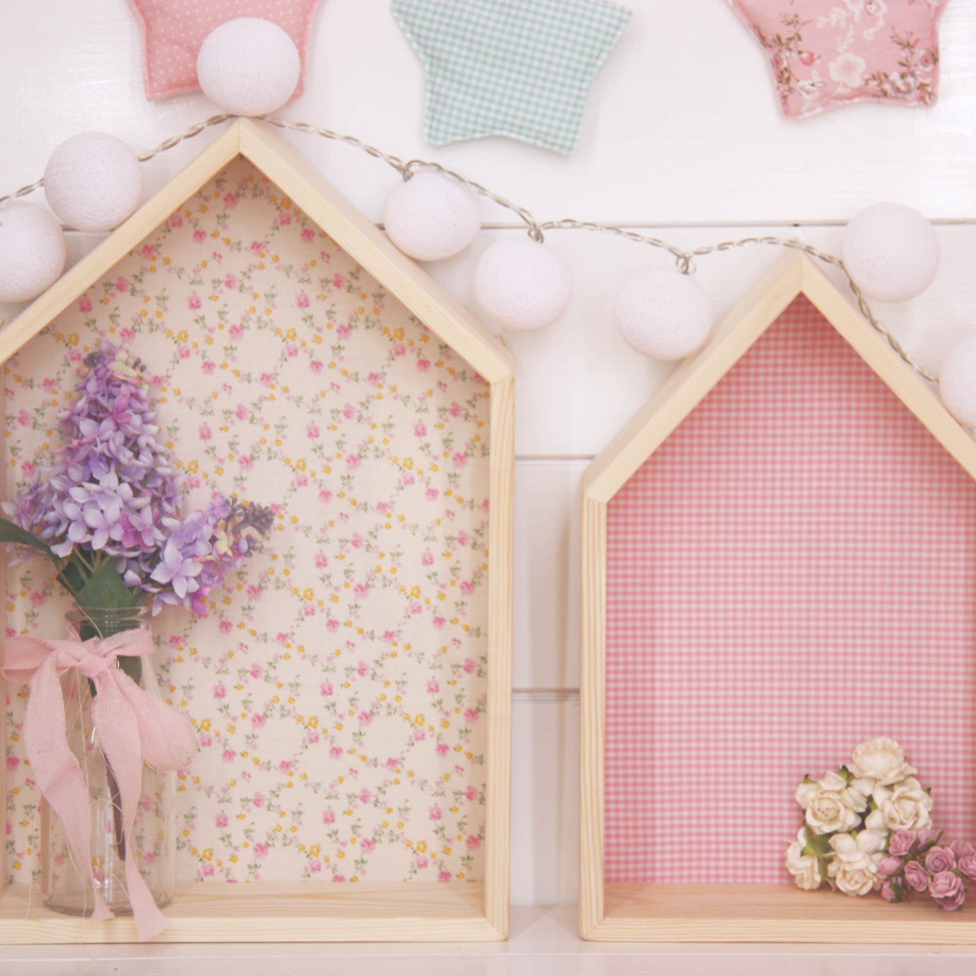 Πανέμορφο ραφάκι σε σχέδιο σπιτάκι σε φυσικό χρώμα με ξύλινη πλάτη ντυμένη με φλοράλ ύφασμα σε αποχρώσεις του ροζ και του κίτρινου. Το ραφάκι είναι από ξύλο πεύκου, χειροποίητο και στα βαμμένα ραφάκια χρησιμοποιούνται πάντα χρώματα οικολογικά κατάλληλα για παιδικά δωμάτια. Στο πίσω μέρος υπάρχουν εξαρτήματα στήριξης και είναι έτοιμο προς τοποθέτηση.