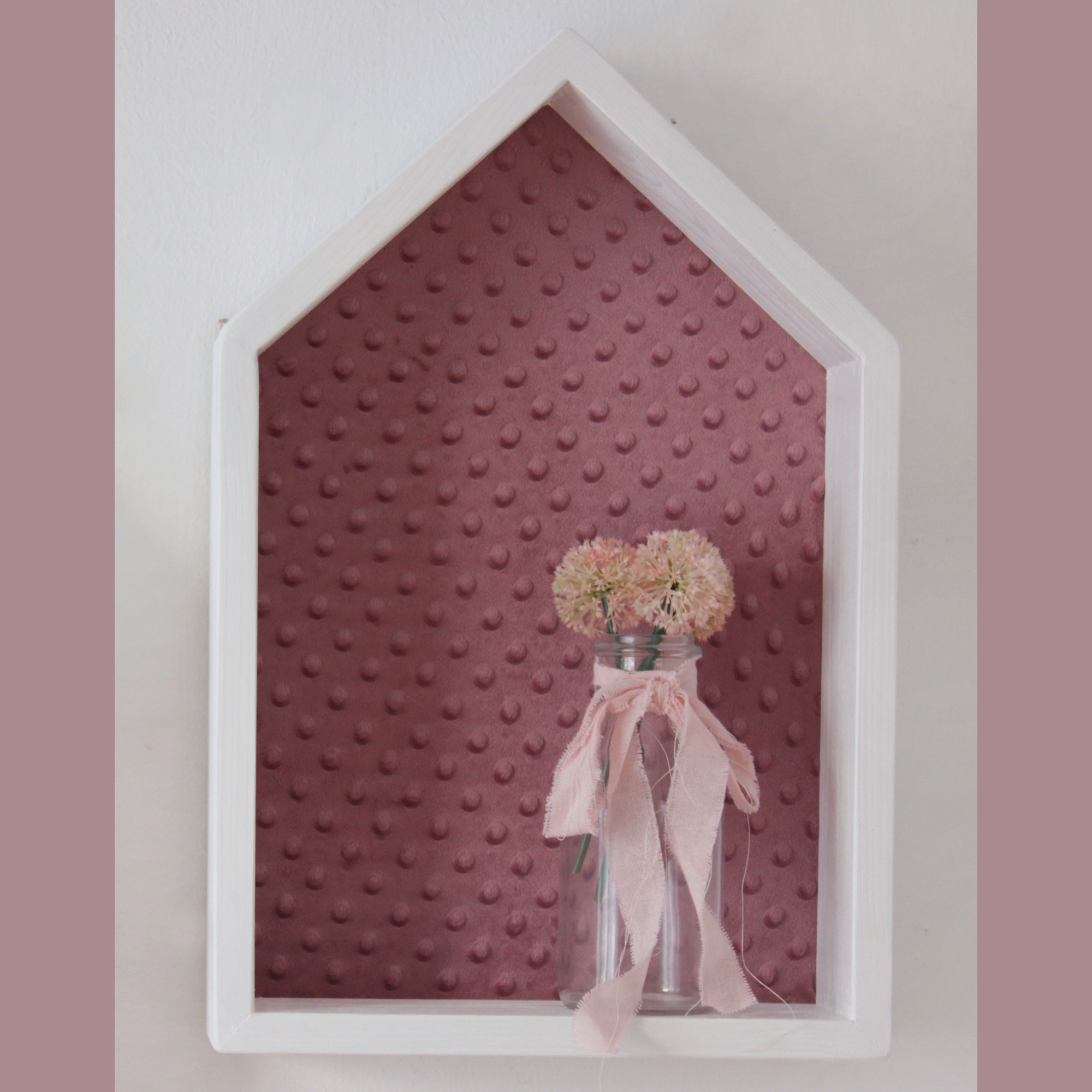 Πανέμορφο ραφάκι σε σχέδιο σπιτάκι σε λευκό χρώμα με ξύλινη πλάτη ντυμένη με απαλό ανάγλυφο πουά βελουτέ ύφασμα σε χρώμα σάπιο μήλο. Το ραφάκι είναι από ξύλο πεύκου, χειροποίητο και στα βαμμένα ραφάκια χρησιμοποιούνται πάντα χρώματα οικολογικά κατάλληλα για παιδικά δωμάτια. Στο πίσω μέρος υπάρχουν εξαρτήματα στήριξης και είναι έτοιμο προς τοποθέτηση.