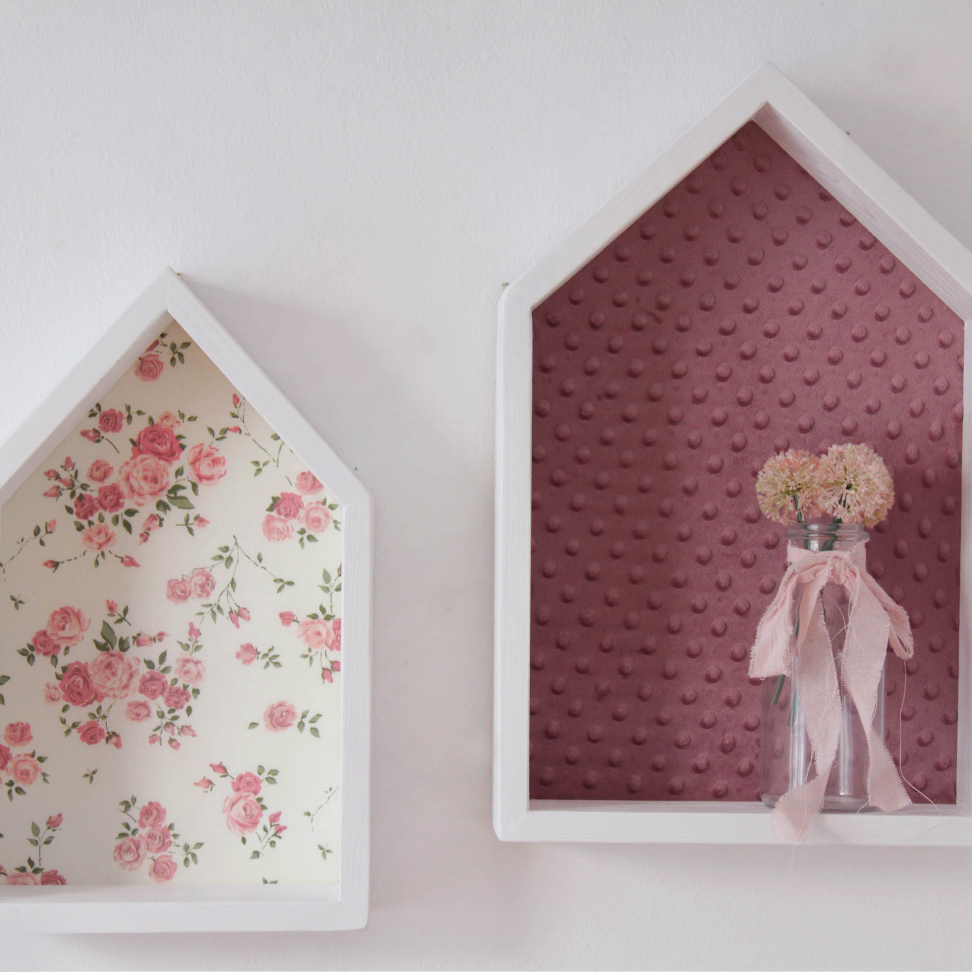 Πανέμορφο ραφάκι σε σχέδιο σπιτάκι σε λευκό χρώμα με ξύλινη πλάτη ντυμένη με φλοράλ ύφασμα σε αποχρώσεις του εκρού , ροζ και του σάπιου μήλου. Το ραφάκι είναι από ξύλο πεύκου, χειροποίητο και στα βαμμένα ραφάκια χρησιμοποιούνται πάντα χρώματα οικολογικά κατάλληλα για παιδικά δωμάτια. Στο πίσω μέρος υπάρχουν εξαρτήματα στήριξης και είναι έτοιμο προς τοποθέτηση.