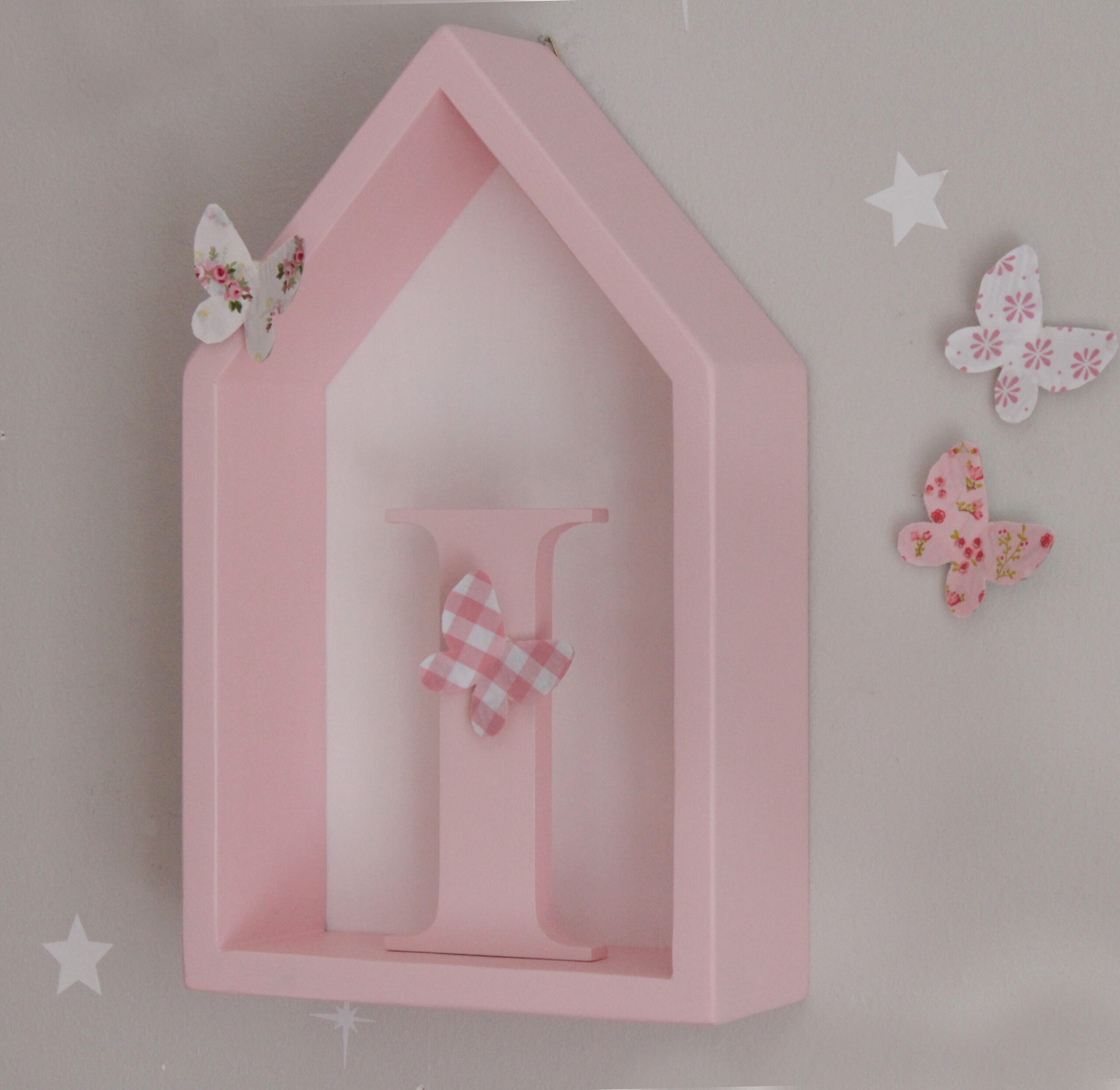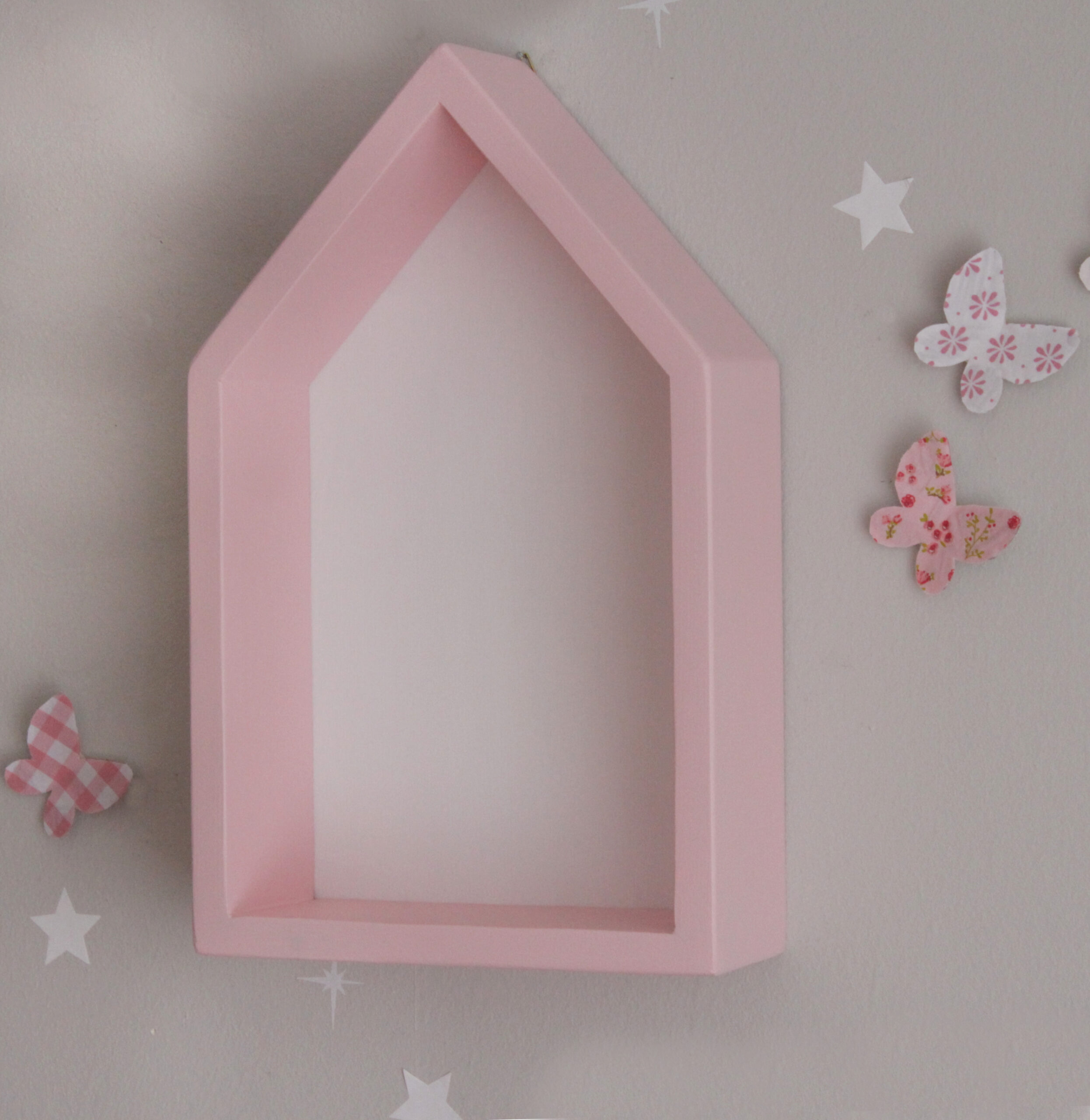 Πανέμορφο ραφάκι σε σχέδιο σπιτάκι σε λευκό χρώμα με ξύλινη πλάτη βαμμένη ροζ. Το ραφάκι είναι από ξύλο πεύκου, χειροποίητο και στα βαμμένα ραφάκια χρησιμοποιούνται πάντα χρώματα οικολογικά κατάλληλα για παιδικά δωμάτια. Στο πίσω μέρος υπάρχουν εξαρτήματα στήριξης και είναι έτοιμο προς τοποθέτηση.