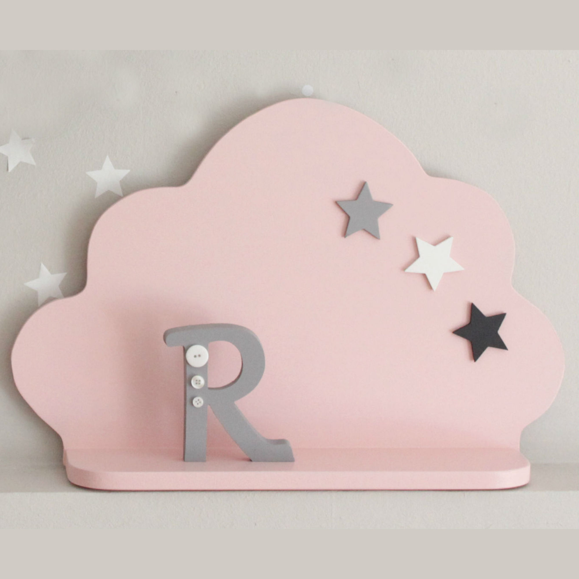 Υπέροχο ραφάκι σε σχέδιο σύννεφο σε ροζ χρώμα με τρία αστεράκια χρώματος γκρι, λευκό και γκρι σκούρο. Από τα πιο αγαπημένα ράφια που μπορεί να συνδυαστεί πολύ όμορφα με το ραφάκι φεγγάρι και να γίνει μία υπέροχη σύνθεση στον τοίχο του παιδικού δωματίου. Eίναι από MDF, χειροποίητο και τα χρώματα που χρησιμοποιούνται είναι οικολογικά κατάλληλα για παιδικά δωμάτια. Στο πίσω μέρος υπάρχουν εξαρτήματα στήριξης και είναι έτοιμο προς τοποθέτηση.
