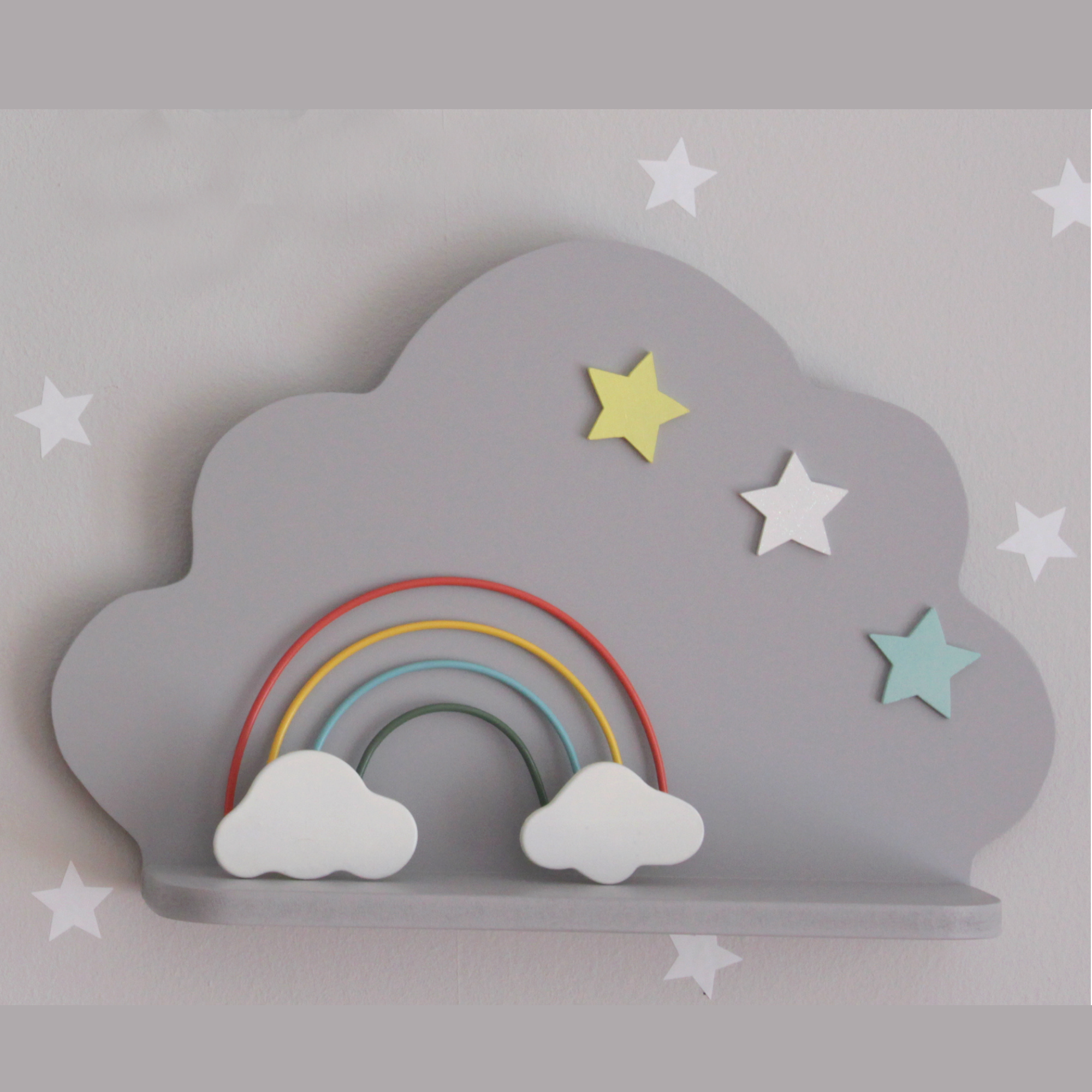 Υπέροχο ραφάκι σε σχέδιο σύννεφο σε λευκό χρώμα με τρία αστεράκια χρώματος θαλασσί,κίτρινο και γκρι. Από τα πιο αγαπημένα ράφια που μπορεί να συνδυαστεί πολύ όμορφα με το ραφάκι φεγγάρι και να γίνει μία υπέροχη σύνθεση στον τοίχο του παιδικού δωματίου.Eίναι από MDF, χειροποίητο και τα χρώματα που χρησιμοποιούνται είναι οικολογικά κατάλληλα για παιδικά δωμάτια. Στο πίσω μέρος υπάρχουν εξαρτήματα στήριξης και είναι έτοιμο προς τοποθέτηση.