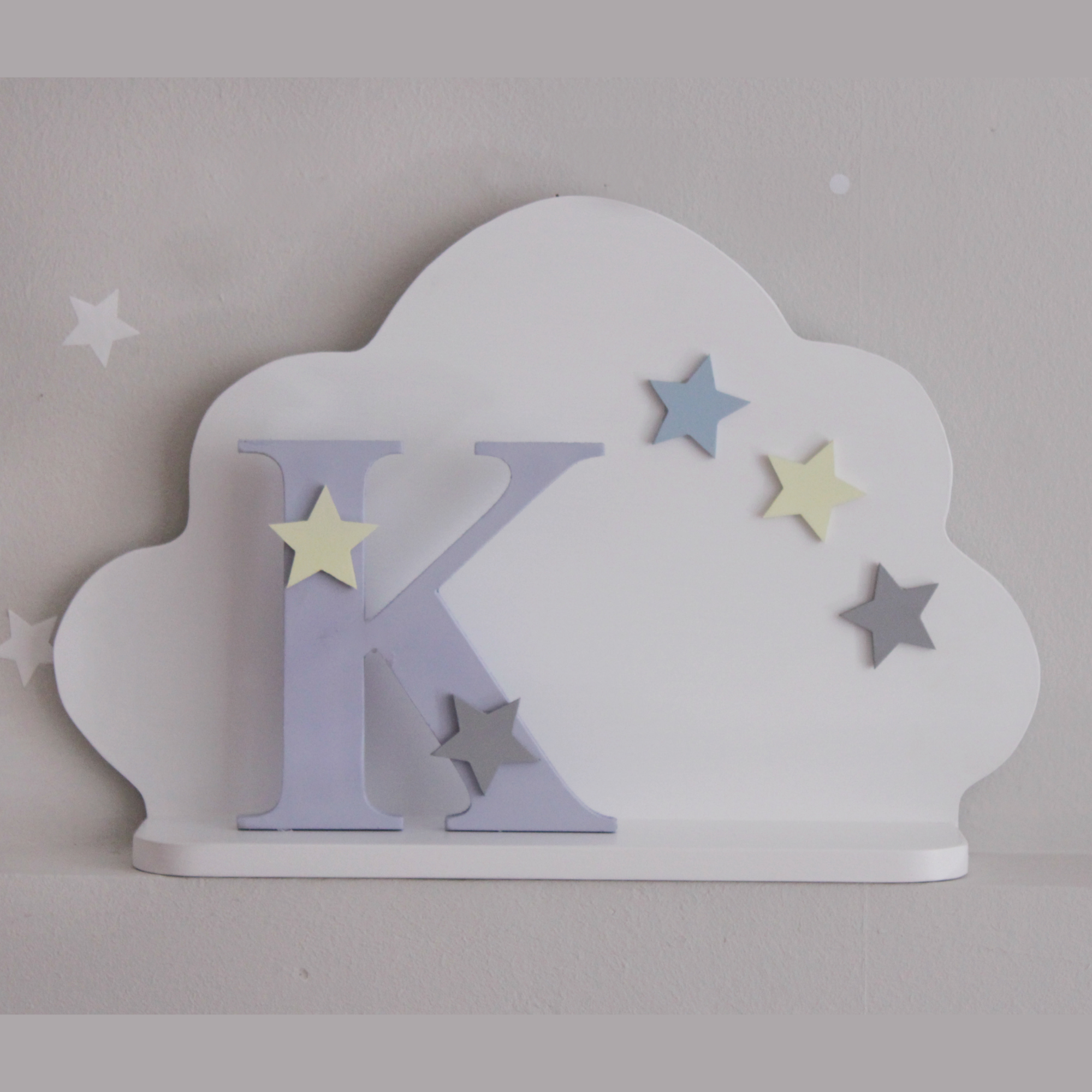 Υπέροχο ραφάκι σε σχέδιο σύννεφο σε λευκό χρώμα με τρία αστεράκια χρώματος θαλασσί,κίτρινο και γκρι. Από τα πιο αγαπημένα ράφια που μπορεί να συνδυαστεί πολύ όμορφα με το ραφάκι φεγγάρι και να γίνει μία υπέροχη σύνθεση στον τοίχο του παιδικού δωματίου. Eίναι από MDF, χειροποίητο και τα χρώματα που χρησιμοποιούνται είναι οικολογικά κατάλληλα για παιδικά δωμάτια. Στο πίσω μέρος υπάρχουν εξαρτήματα στήριξης και είναι έτοιμο προς τοποθέτηση.