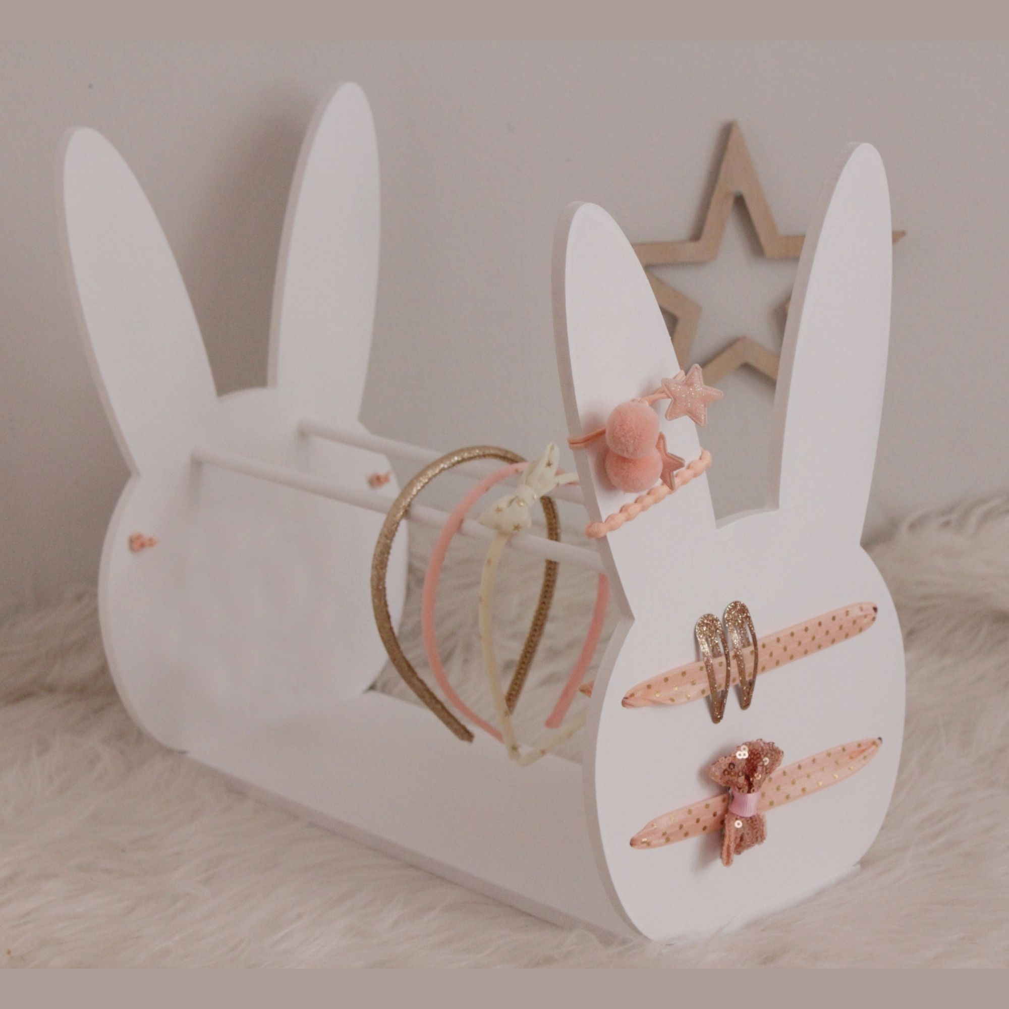 Κοκκαλάκια, στέκες, λαστιχάκια μαντήλια βρήκαν τη θέση τους για να είναι τακτοποιημένα και ορατά ανά πάσα στιγμή! Ξύλινες βάσεις για αξεσουάρ που γίνονται παιχνίδι ακόμα και για τις πιο ακατάστατες! Ξύλινη βάση σε σχέδιο λαγό και χρώμα λευκό.
