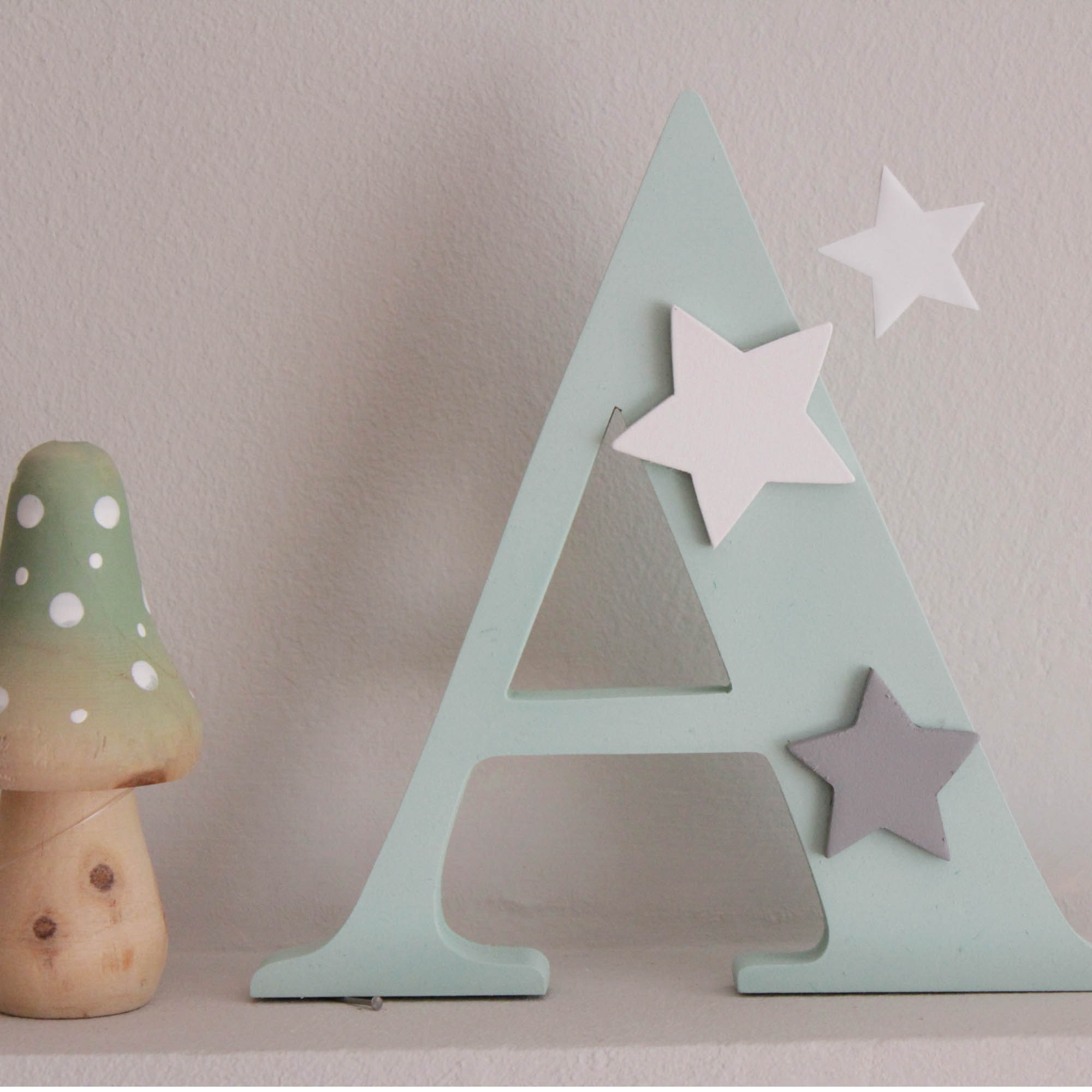 Μοναδικά ξύλινα διακοσμητικά γράμματα ,ένα στολίδι που κάθε παιδικό δωμάτιο πρέπει να έχει ! Γράμμα σε χρώμα μέντα με διακόσμηση ξύλινα αστεράκια σε γκρι και λευκό. Τα γράμματα είναι από mdf και βαμμένα με οικολογικά χρώματα κατάλληλα για το βρεφικό δωμάτιο. Σε περίπτωση που επιθυμείτε διαφορετικά χρώματα μπορείτε να κάνετε τον δικό σας μοναδικό συνδυασμό στην κατηγορία “custom” !