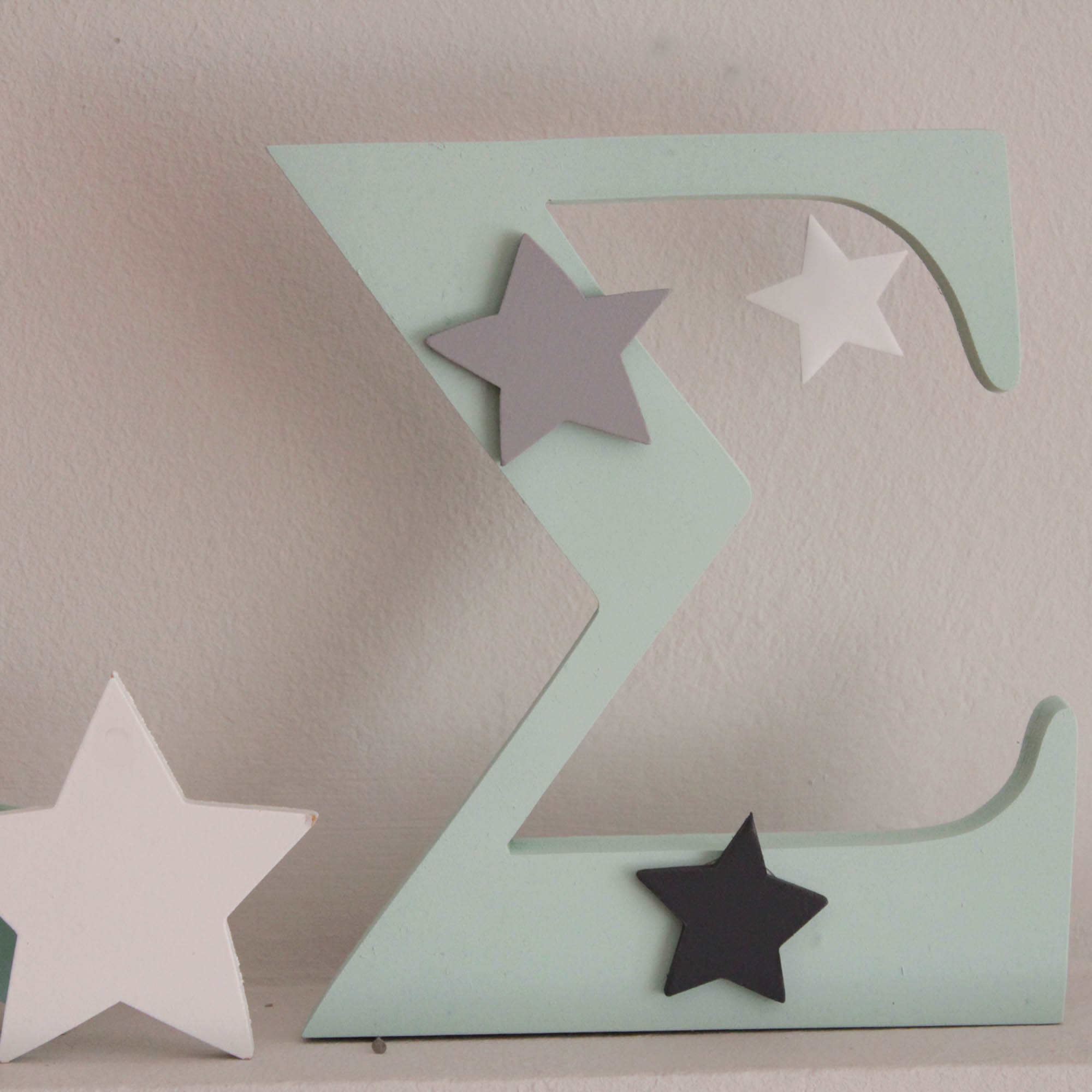 Μοναδικά ξύλινα διακοσμητικά γράμματα ,ένα στολίδι που κάθε παιδικό δωμάτιο πρέπει να έχει ! Γράμμα σε χρώμα μέντα με διακόσμηση ξύλινα αστεράκια σε γκρι και γκρι ανθρακί. Τα γράμματα είναι από mdf και βαμμένα με οικολογικά χρώματα κατάλληλα για το βρεφικό δωμάτιο. Σε περίπτωση που επιθυμείτε διαφορετικά χρώματα μπορείτε να κάνετε τον δικό σας μοναδικό συνδυασμό στην κατηγορία “custom” !