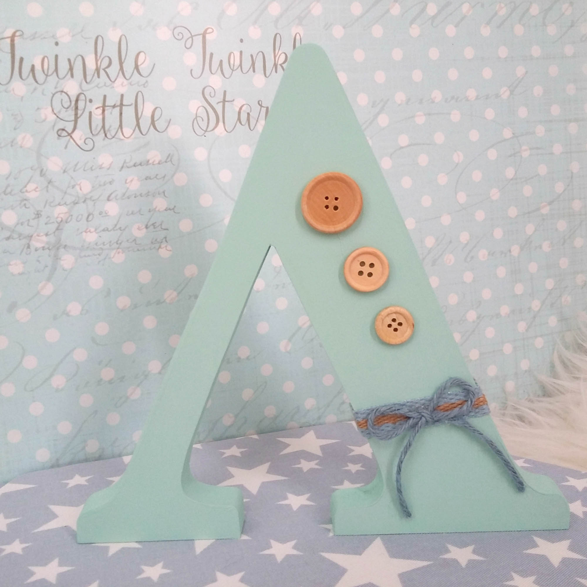 Μοναδικά ξύλινα διακοσμητικά γράμματα ,ένα στολίδι που κάθε παιδικό δωμάτιο πρέπει να έχει ! Γράμμα σε χρώμα μέντα με διακόσμηση ξύλινα κουμπάκια και θαλασσί φιογκάκι. Τα γράμματα είναι από mdf και βαμμένα με οικολογικά χρώματα κατάλληλα για το βρεφικό δωμάτιο.Σε περίπτωση που επιθυμείτε διαφορετικά χρώματα μπορείτε να κάνετε τον δικό σας μοναδικό συνδυασμό στην κατηγορία “custom” !