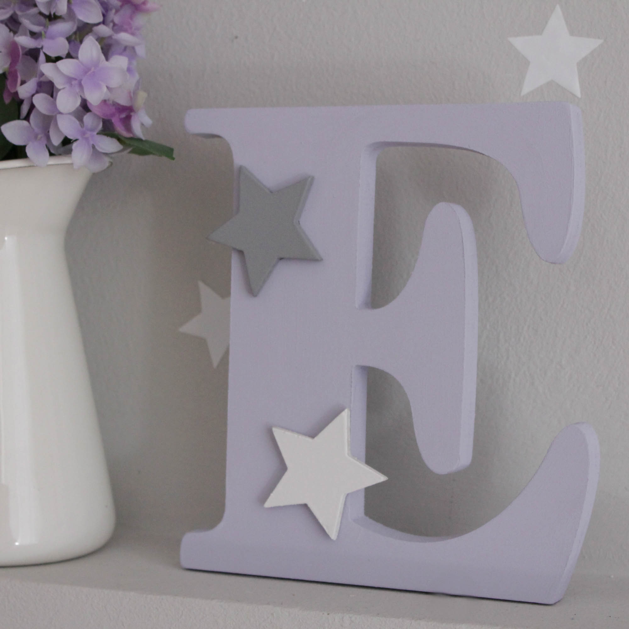 Μοναδικά ξύλινα διακοσμητικά γράμματα ,ένα στολίδι που κάθε παιδικό δωμάτιο πρέπει να έχει ! Γράμμα σε χρώμα λιλά με διακόσμηση ξύλινα αστεράκια σε γκρι και λευκό. Τα γράμματα είναι από mdf και βαμμένα με οικολογικά χρώματα κατάλληλα για το βρεφικό δωμάτιο. Σε περίπτωση που επιθυμείτε διαφορετικά χρώματα μπορείτε να κάνετε τον δικό σας μοναδικό συνδυασμό στην κατηγορία “custom” !
