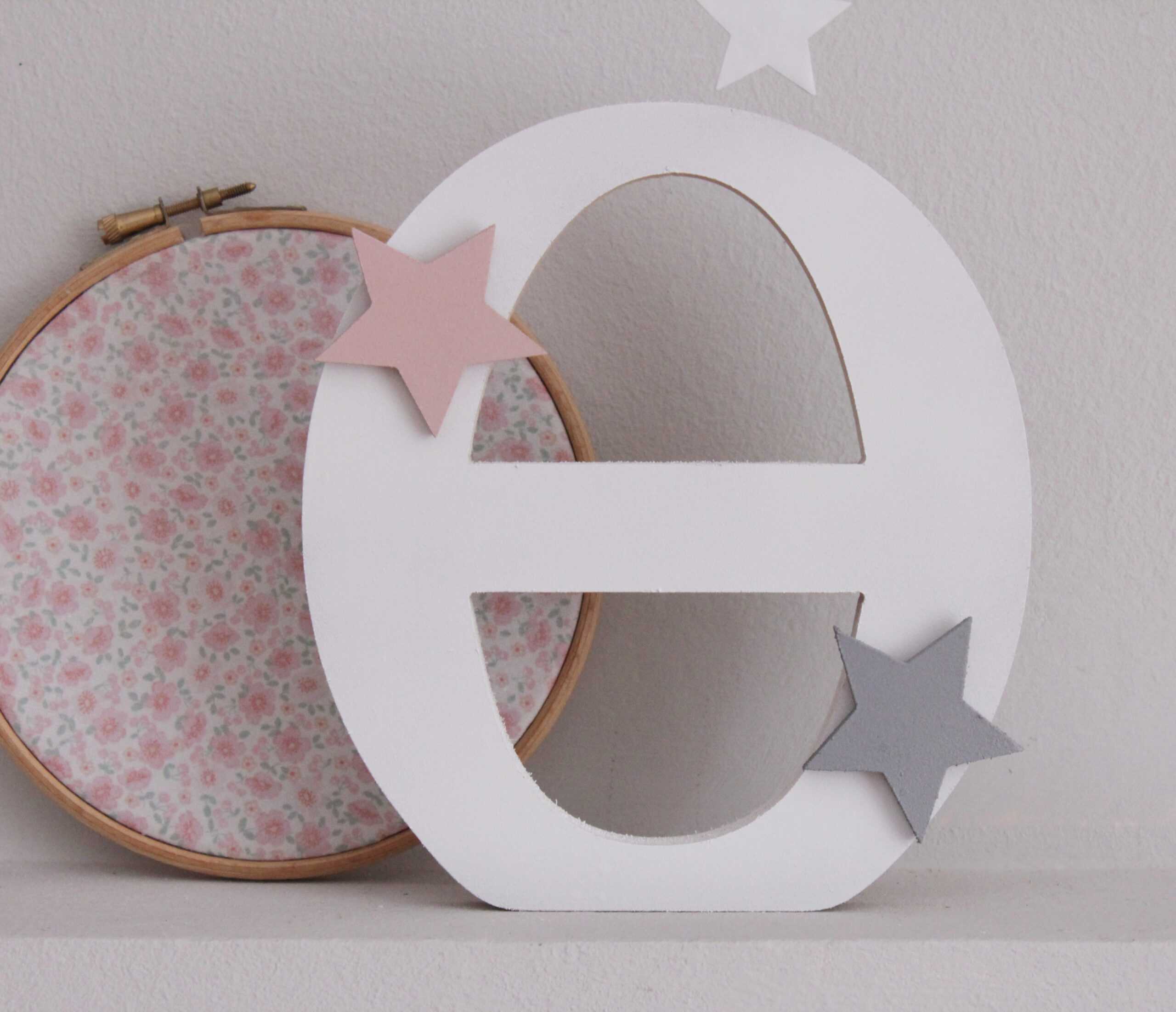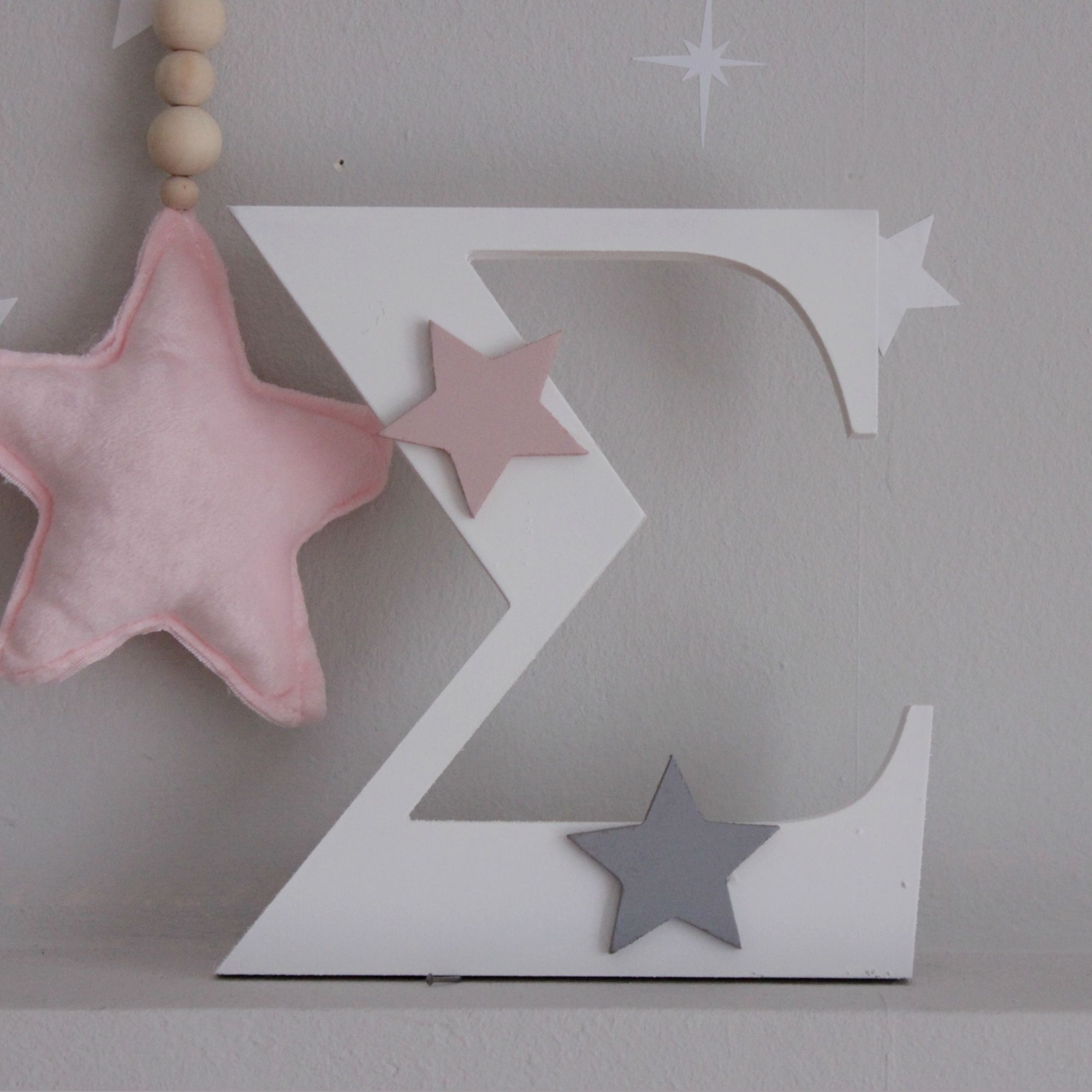 Μοναδικά ξύλινα διακοσμητικά γράμματα ,ένα στολίδι που κάθε παιδικό δωμάτιο πρέπει να έχει ! Γράμμα σε λευκό χρώμα με διακόσμηση ξύλινα αστεράκια σε ροζ και γκρι. Τα γράμματα είναι από mdf και βαμμένα με οικολογικά χρώματα κατάλληλα για το βρεφικό δωμάτιο. Σε περίπτωση που επιθυμείτε διαφορετικά χρώματα μπορείτε να κάνετε τον δικό σας μοναδικό συνδυασμό στην κατηγορία “custom” !