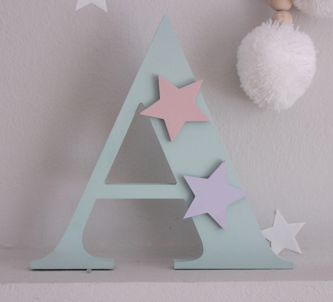 Μοναδικά ξύλινα διακοσμητικά γράμματα ,ένα στολίδι που κάθε παιδικό δωμάτιο πρέπει να έχει ! Γράμμα στο χρώμα της μέντας με διακόσμηση ξύλινα αστεράκια σε ροζ και θαλασσί / λιλά. Τα γράμματα είναι από mdf και βαμμένα με οικολογικά χρώματα κατάλληλα για το βρεφικό δωμάτιο. Σε περίπτωση που επιθυμείτε διαφορετικά χρώματα μπορείτε να κάνετε τον δικό σας μοναδικό συνδυασμό στην κατηγορία “custom” !